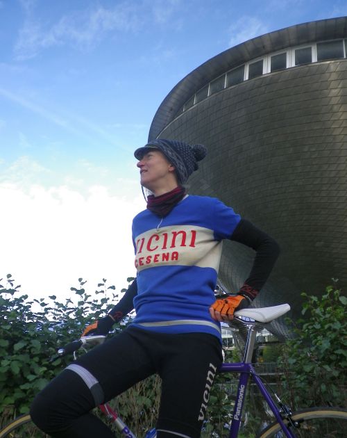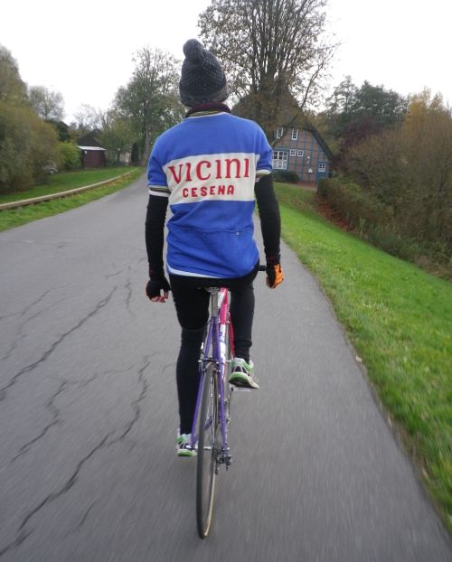Wir machen uns dann fertig zur Ausfahrt. Juliane zog meine sehr schönen, alten VICINI CESENA (als Vicini ist das für Cesena was Chesini für Verona und Sambi für Ravenna ist) an mit passender Liquigasmütze und zur Sicherheit einer Pudelmütze darüber. Sie durfte sich eines meiner Räder aussuchen und entschied sich für das Panasonic PR4000. Eine gute Wahl.