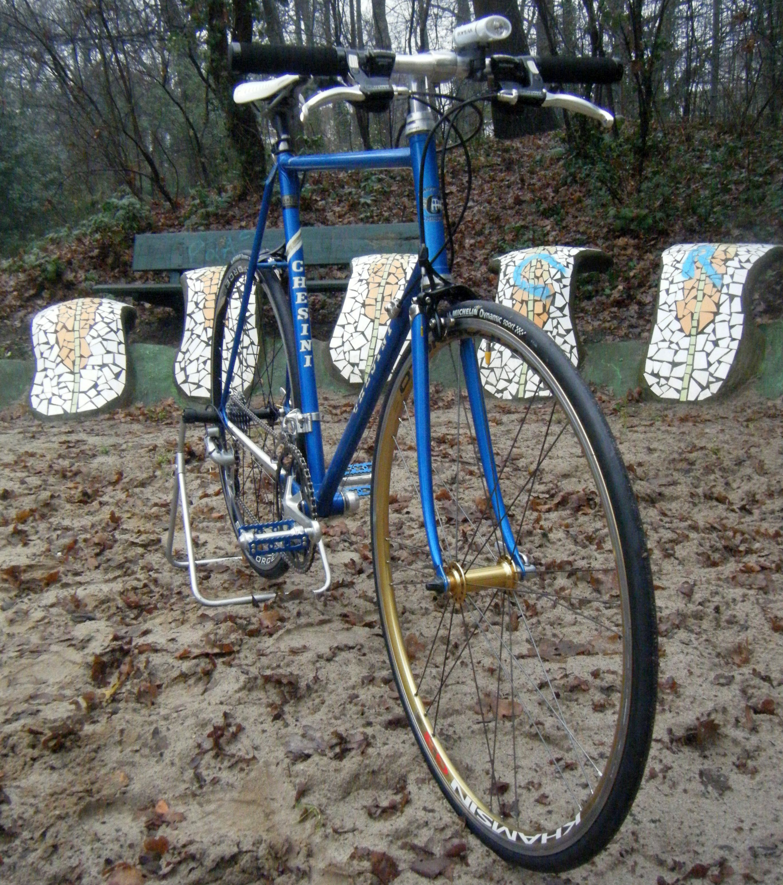 Das Vorderrad des Giant (Spinforce Eigenmarke) war komplett zerstört, das Hinterrad aber noch prima in Schuss. Rein zufällig hatte ich ein goldenes Campagnolo Khamsin Vorderrad erstanden, dass auch nicht schlecht zu dem Teil passte. Ebenso mussten bei dem Unfall die Kurbel und die Pedale dran glauben, so dass ich die originale Shimano 600 Trikolore Kurbel nahm und dafür gut passende blau eloxierte MKS Touring Pedalen kaufte.