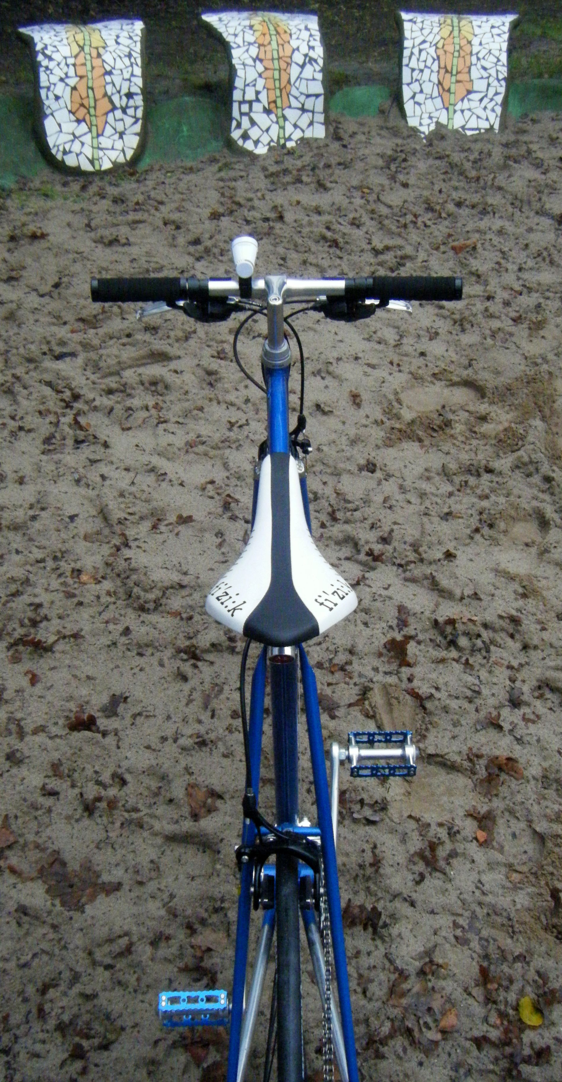 Wir einigten uns dann darauf einen blauen Chesini Rahmen zu verwenden, der eigentlich schon als Rennrad mit Shimano STI Ultegra 10-fach für ihn aufgebaut war aber nie gefahren wurde, und daran die Komponenten des Giants zu bauen. Mein Sohn möchte nämlich gerne einen flachen Lenker und Schaltung am Lenker. Also wurde quasi alles was heil geblieben ist von dem Giant auf das Chesini transplantiert. Als Lenker habe ich dann aber doch etwas gekauft was nicht ganz so breit ist wie das Arschgeweih von Cindy aus Marzahn. Und bei dieser Gelegenheit kam dann noch ein alter, gebrauchter aber eben sehr bequemer Fizik Arione als Sattel zum Einsatz.