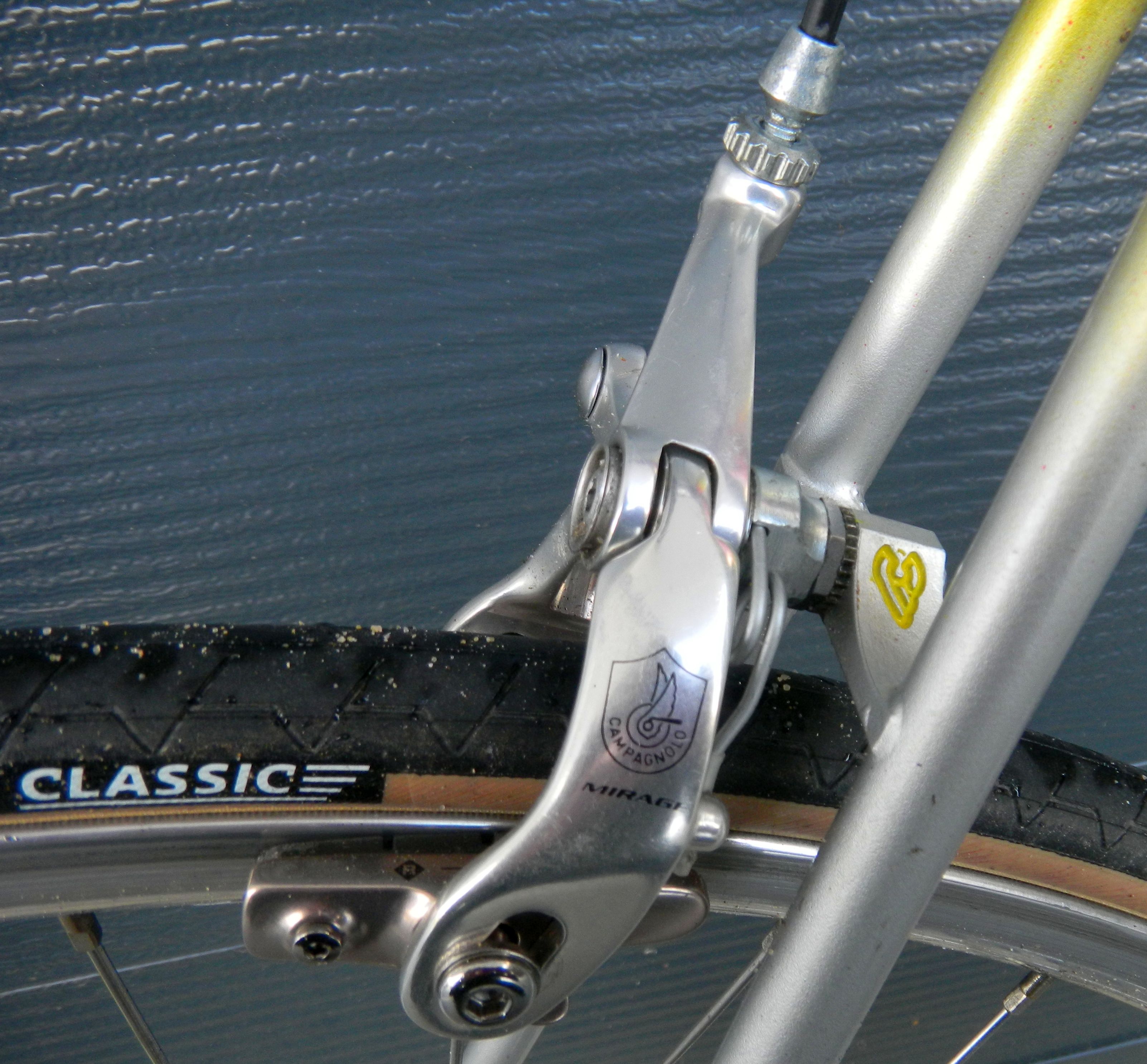 Durch einen Zufall kam ich günstig an alte 8-fach Campagnolo Mirage Ergopower Hebel zusammen mit den dazugehörigen Bremsen. Ok, dachte ich mir, das ist ein guter Startpunkt um einen italienischen Rahmen mit Campagnolo und Cinelli Komponenten aufzubauen. Warum Cinelli? Weil sowohl die Gabel des Vettas als auch der Bremsteg Cinelli Pantographien hat.