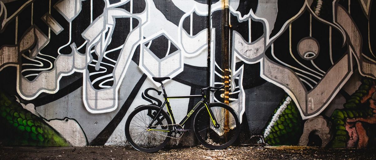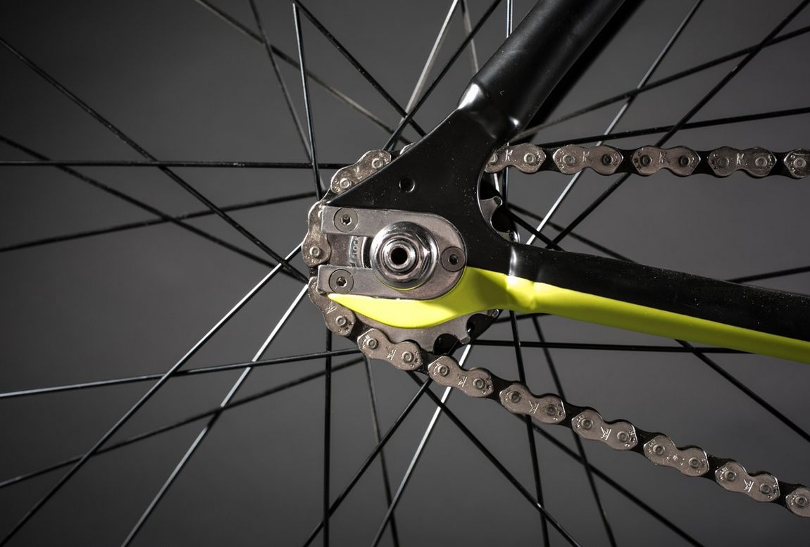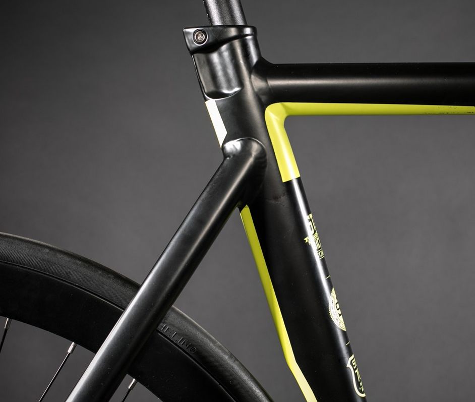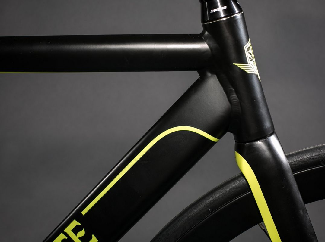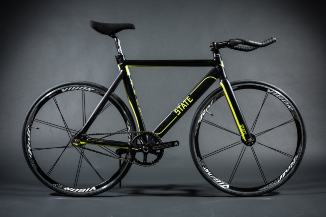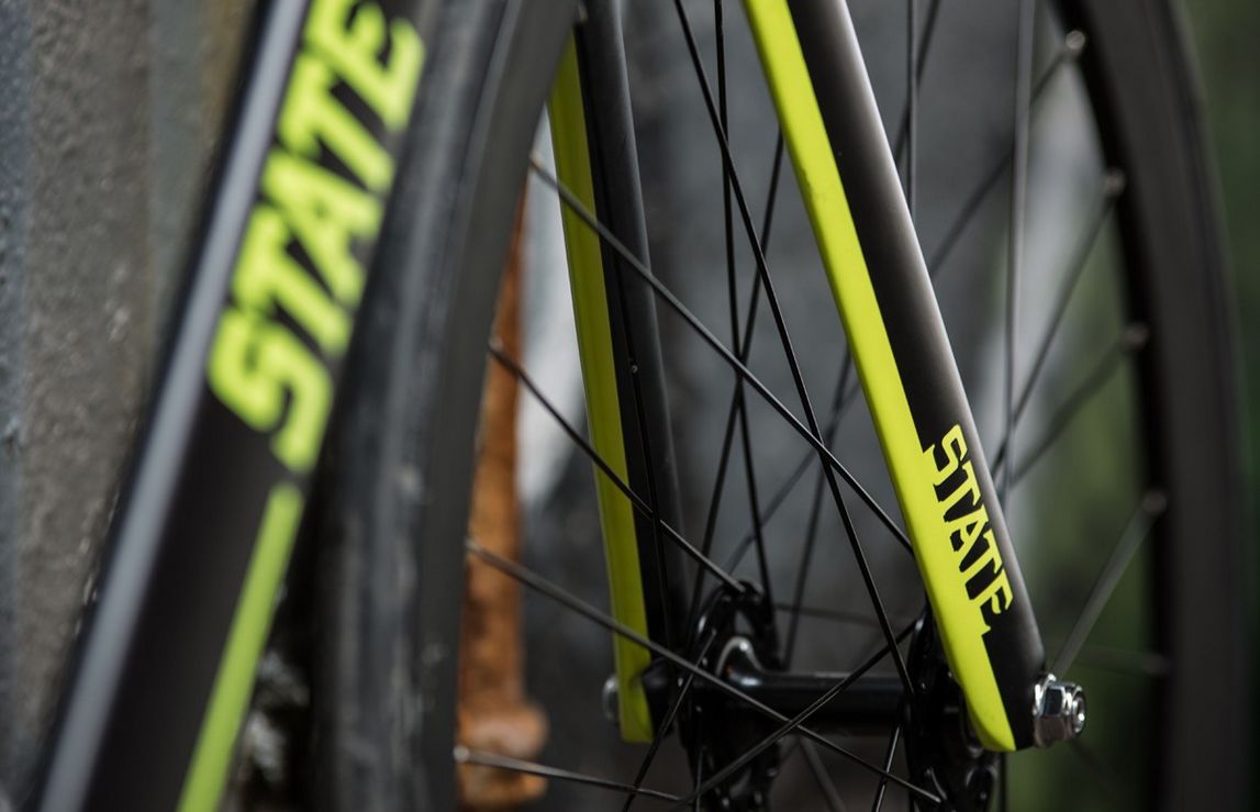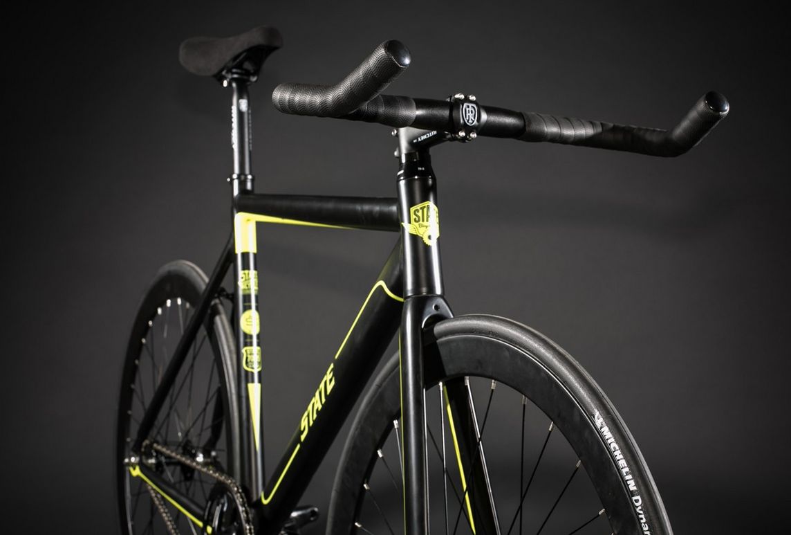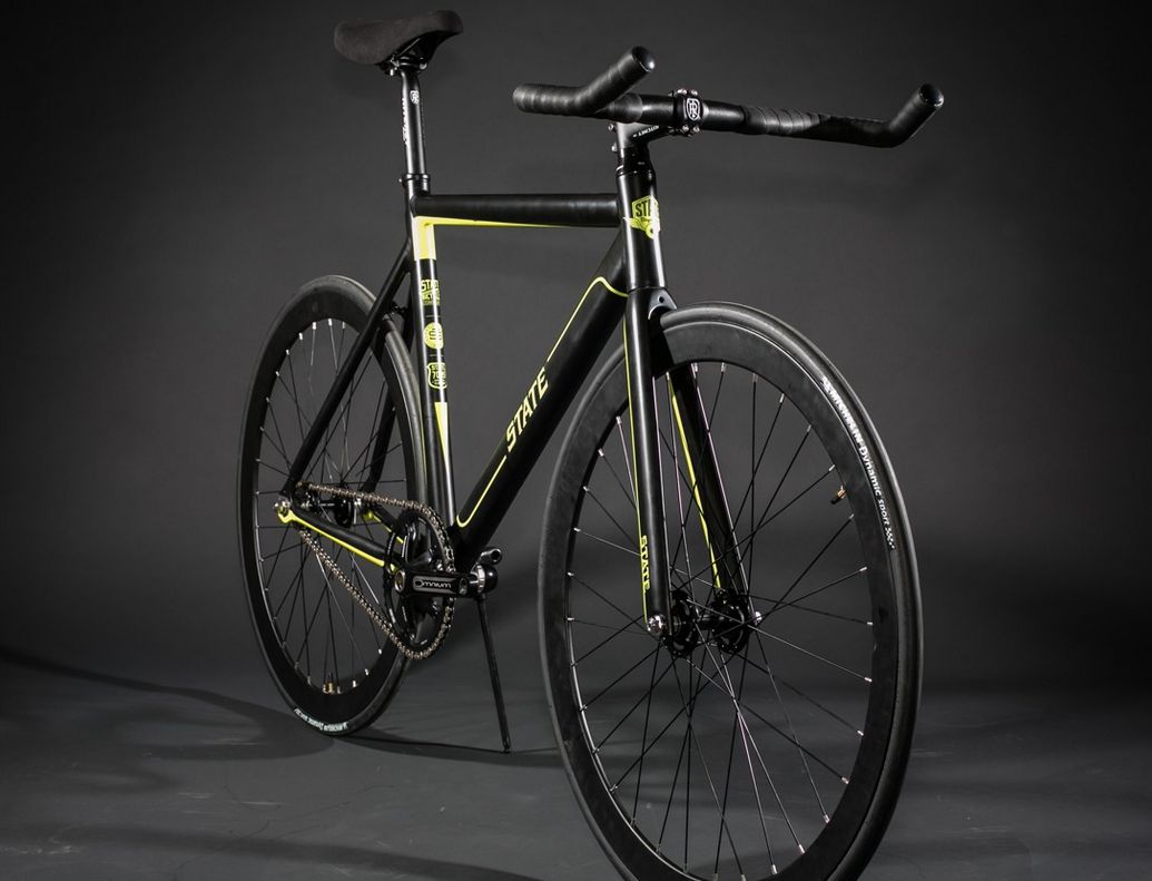 Ein wichtiger Beitrag zum Thema Gierige Räder. Die gelbe Linienführung alleine über Kettenstrebe, Unterrohr und Gabel alleine gibt schon eine Million Punkte von 1.000.000 möglichen. Via State Bicycle Company.