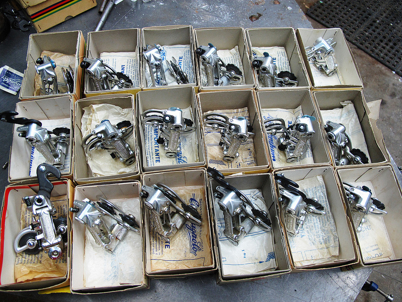 I will also include the following duplicate Nuovo Record derailleurs NOT SHOWN in the Flickr set: 1972, 1973, 1973, 1979, 1984, and 11. Also included is a steel pre-1970 Record steel derailleur. These are all also NIB/NOS. You will receive thirty three Campagnolo rear derailleurs and sixteen lever assemblies.
