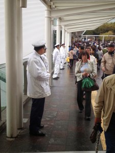 Jerome and I visited some of the booths, and as the rain stopped early afternoon, we saw a points race with Alejandro Valverde, Fumi Beppu and others. The Japanese police did their very best to ensure that no one stood on the walkways, staircases or other places where it would be possible to actually SEE the riders as they passed in both directions.