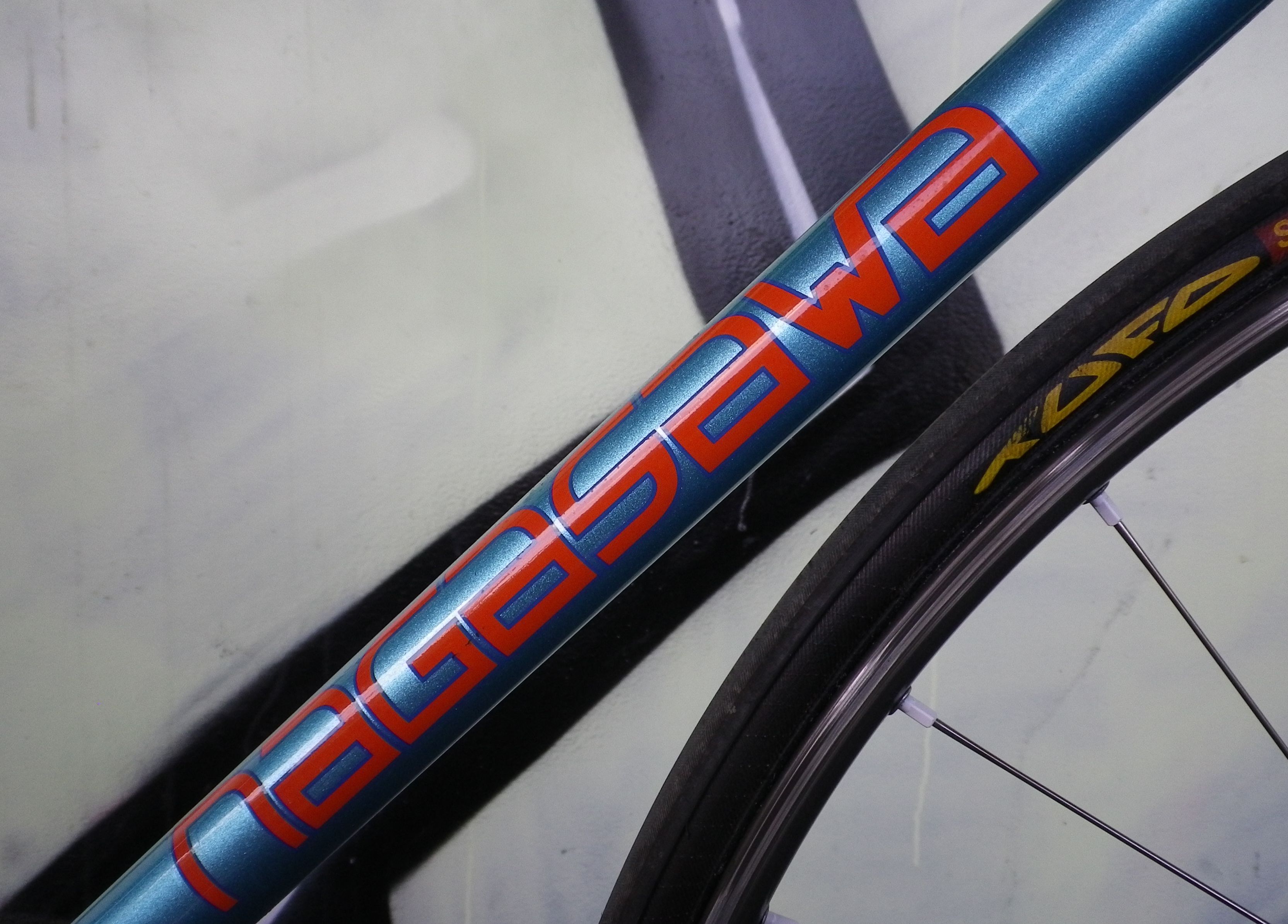 Der Rahmen ist in einem sehr schön glänzenden blau lackiert mit sehr wenigen Beschädigungen. Neben den orangen Schriftzügen am Unterrohr sind die Muffen gelb ausgelegt. Noch viel mehr orange machte da wenig Sinn. Da ohnehin die viel zu guten Laufräder meines Bassos zum Einsatz kommen würden war das Thema in der Kombination „Schwarz/Silber“ quasi vorgegeben und so schaute ich mich nach entsprechenden Komponenten um.