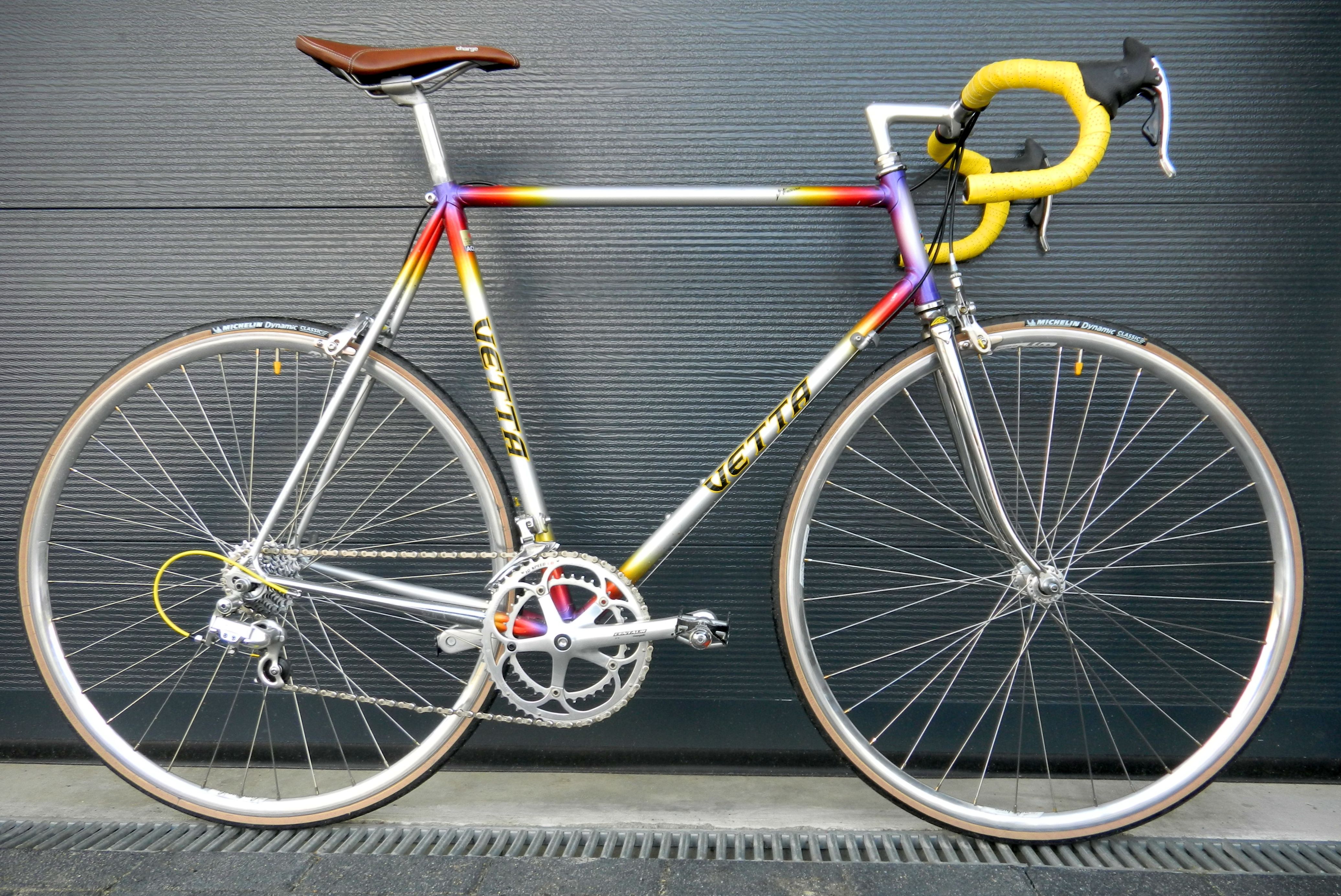 Ein schöner, bunter Rahmen, den man mögen muss. Ich hatte ihn mit Campa bestückt, aber letztendlich war er mir etwas zu klein und ich hatte auch noch besserer in der Garage stehen. Deshalb habe ich das Rad komplett wieder auseinander gebaut und verkaufe nur den Rahmen.