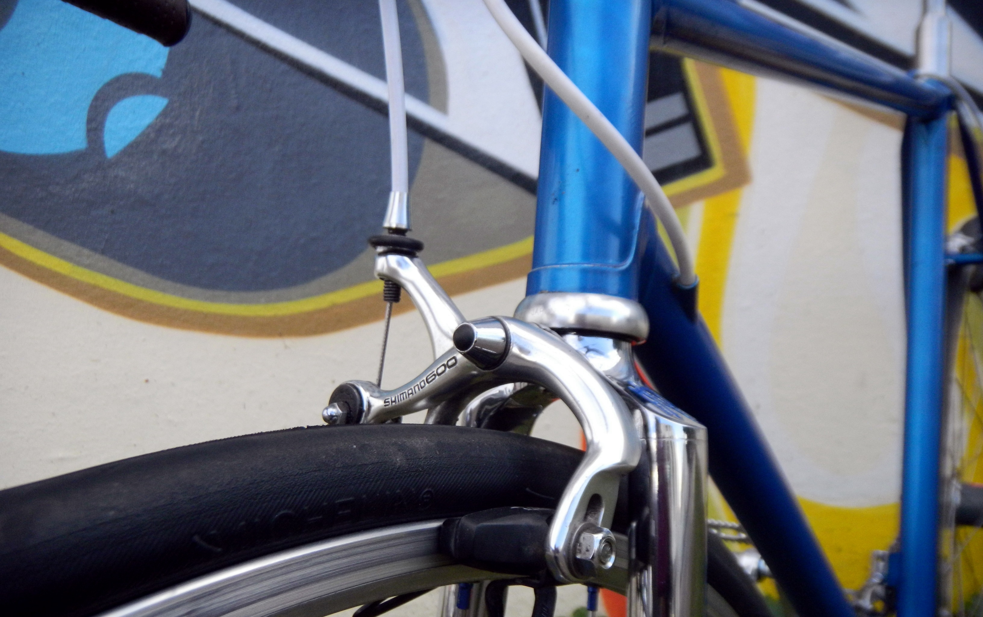 Bei aller Liebe zu Campa, ich mag deren Skeleton Bremsen nicht. Ob da wirklich eine gute Idee ist vorne Dual Pivot und hinten Single Pivot Bremsen zu verbauen – das wage ich bei der Gelegenheit auch mal zu bezweifeln. Die Bremswirkung der Campa Bremsen ist aber, vor allem die Dosierbarkeit besser als bei den neueren Shimano Modellen, aber ich mag lieber ganze Teile die auch einfacher zu reinigen sind, als diese gerupften Dinger in denen sich der Bremsdreck festsetzt. Die einzigen Bremsen die nicht Skeleton sind, sind die Veloce und die Centaur Versionen, wobei ich mal behaupten möchte dass die auch im wesentlichen gleich sind. Die Veloce verbaue ich unheimlich gerne, die sind günstig, die besten Bremsen die ich kenne aber haben diesen uncoolen Veloce Schriftzug. Nun gibt es aber ein cooles Radiergummi mit dem man diesen uncoolen Schriftzug cool und locker wegradieren kann und voila: alles perfekt und cool. Es gabe eine Zeit bei Campagnolo, da waren die Gruppennamen auf den Teilen notiert (Record, Chorus, Daytona, Athena, Veloce, Mirage…) bis auf die Chorus Gruppe, die hatte keinen Namen neben dem Campagnolo Logo. So kann man also Veloce Bremsen recht gut zu coolen Chorus Bremsen pimpen, zumindest ideell.