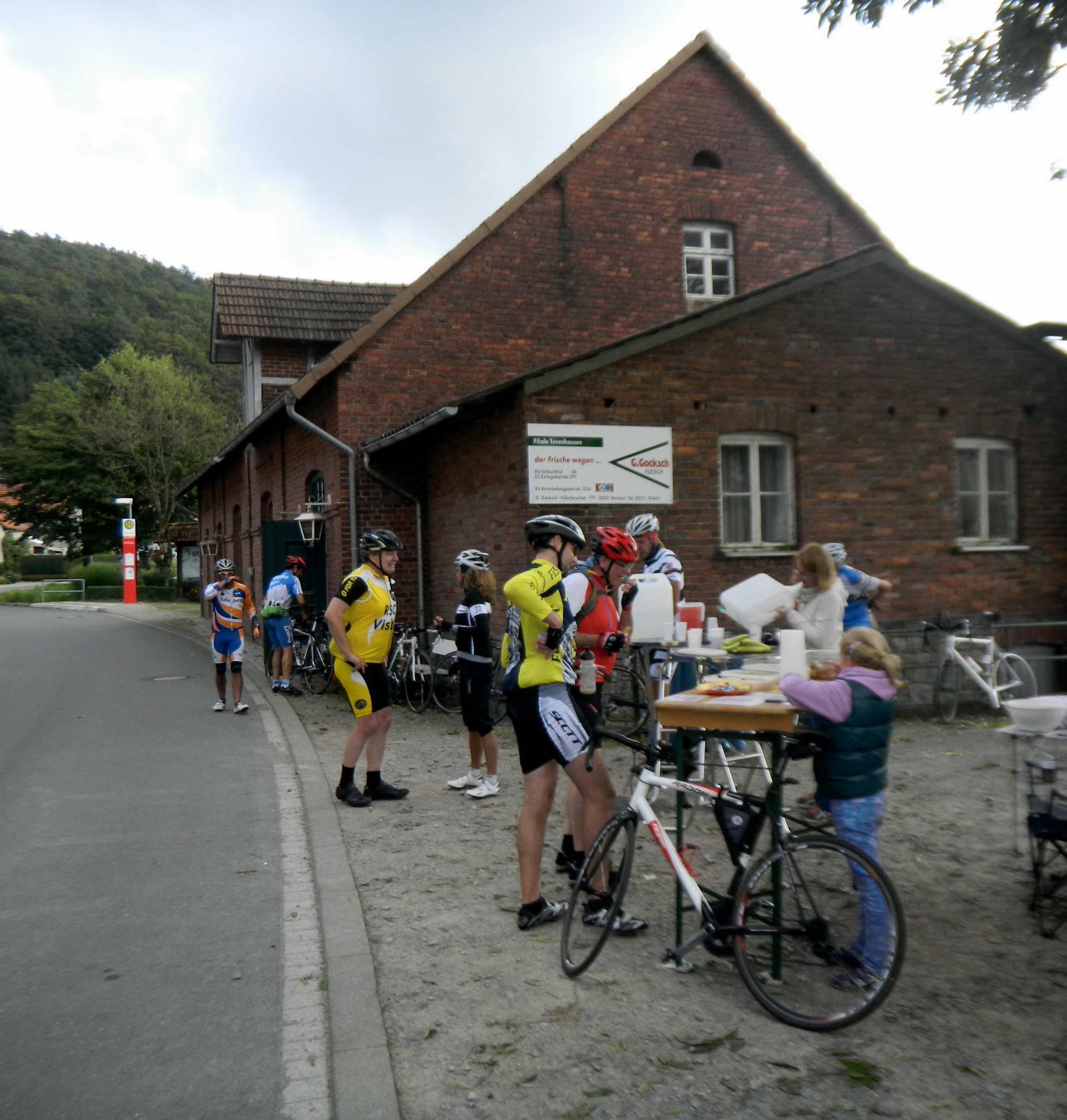 „Ein Salamibrötchen bitte“ „Das macht 50 Cent.“ Eigentlich möchte man ja dann sagen: „OK, geben Sie mir alle, ich verkaufe die am Montag vor der Uni für ’nen Euro“ aber wir sind fürs Radfahren und nicht für den Profit gekommen. An der ersten Station in Hemeringen nach ca. 30 km beisse ich in zwei leblose und labrige Waffeln bevor Hannes mir sagt, dass hier besonders das selbstgemacht Rosinenbrot zu empfehlen ist. Das ist wirklich gut. es gibt quasi alle 25 km eine Verpflegungsstation und so brauche ich nur einmal auf einen Riegel zurückzugreifen. Rosinenbrot gibt es überall. Bananen, Obst, Müsliriegel, nichts außergewöhnliches aber eben gut für eine RTF. Am Ende gibt es dann noch gegrillte Bratwurst und Kuchen. Der ist aber leider schon fast weg, da wir zwei Stunden nach der Meute gestartet sind und uns viel Zeit gelassen haben.