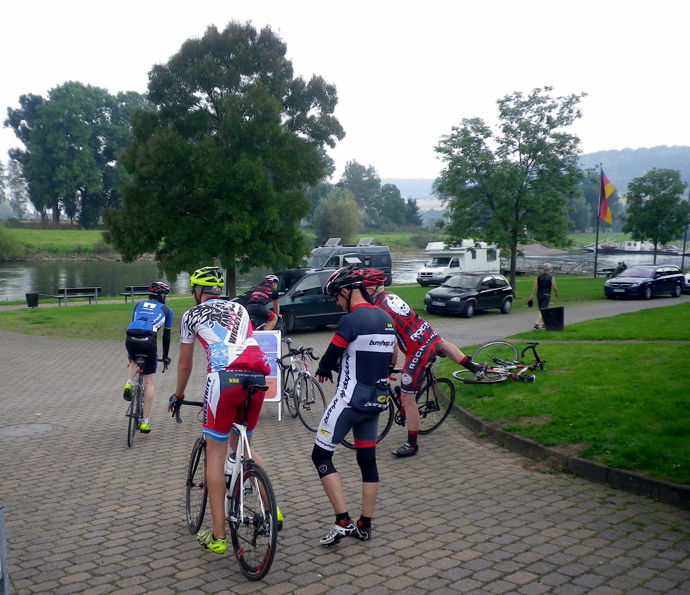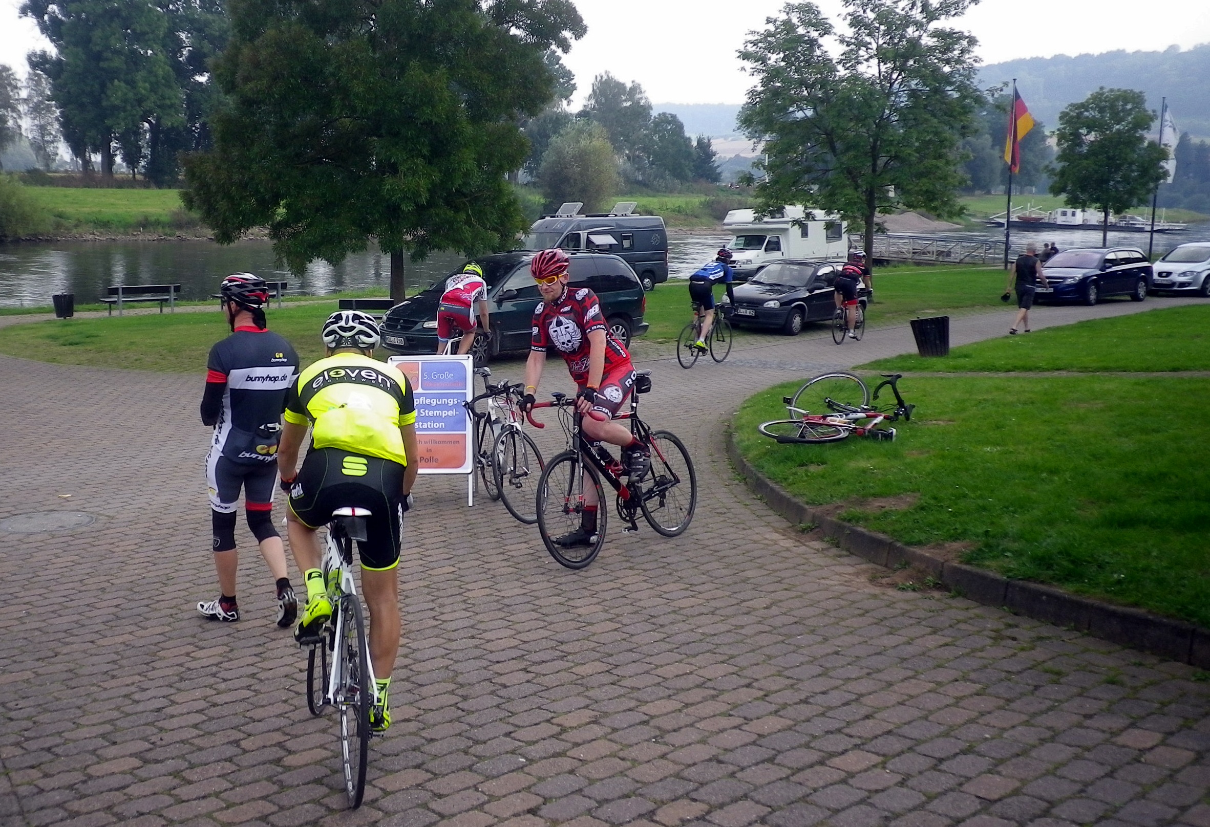 Der letzte Rast in Polle ist der Hit: Wir sitzen auf einer Terasse auf einem Campingplatz an der Weser und bekommen Getränke, Kaffee und vor allem Erdbeerkuchen umsonst.Eigentlich wollen wir gar nicht mehr weiter und wünschten uns Torsten wäre mit seinem Eifelland Wohnwagen da. Am Ende dann auch noch Essen am Start. Alles wirklich gut organisiert.