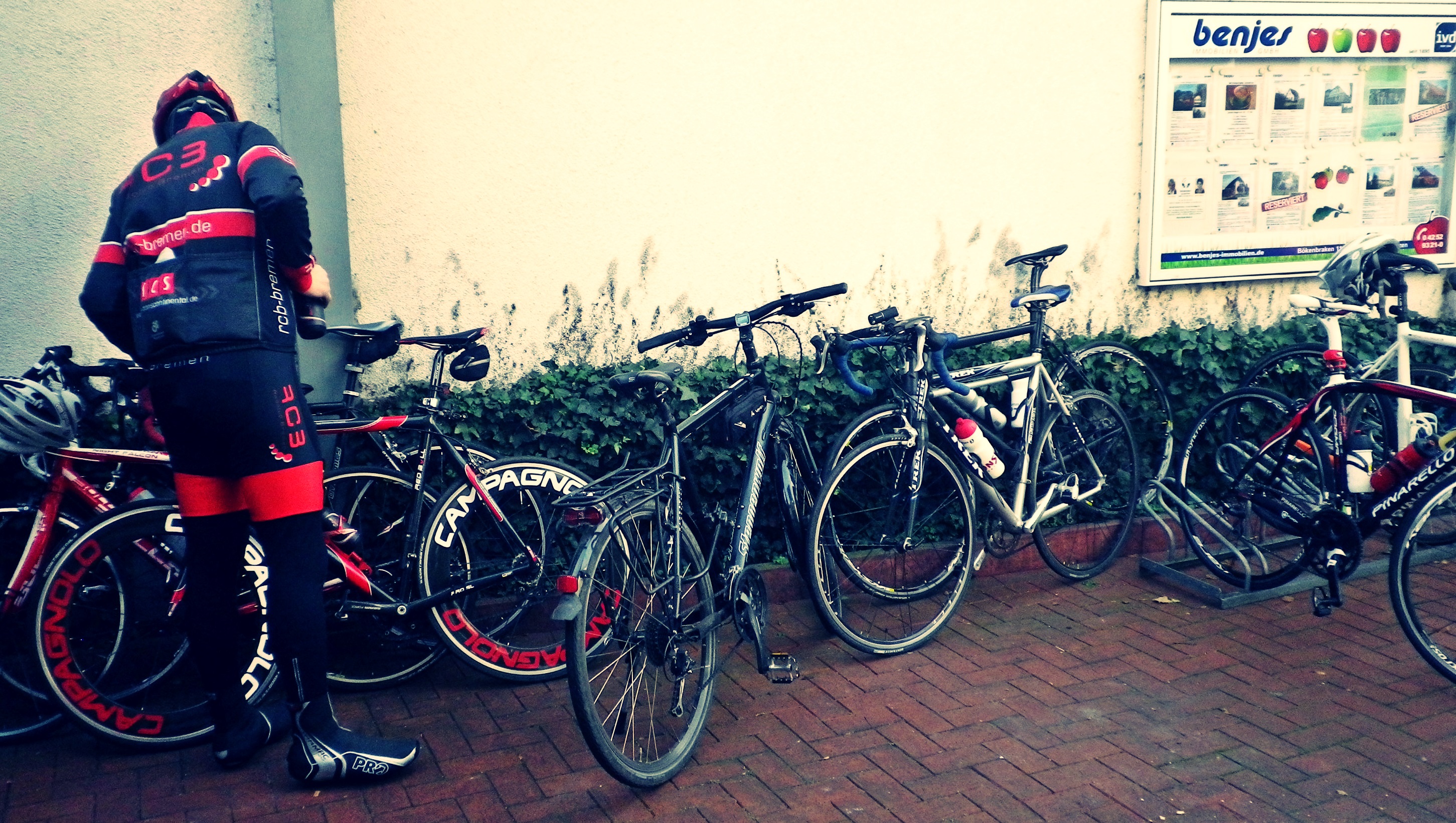 Damit machen wir uns nun auf den Weg die anderen einzuholen. Wir haben insgesamt fast 40 Minuten Zeit verloren und treten nun so richtig rein. Jonas muss als Strafe Führungsarbeit leisten, vor allem wenn es gegen den Wind geht und die Hügelchen hoch, also quasi immer. Ruckzuck sind wir in Südweyhe und biegen nach Okel ab. Rechts und links schwirren die kleinen Ortschaften vorbei, wir treten rein bis den Maximalpuls erreicht haben und sind nur beseelt von einem Gedanken: „Wir wollen unser Stück Kuchen in Bruchhausen-Vilsen.“ Okel…Gödestorf, ab und zu mach ich mich nun auch vorne lang… Wachendorf…Süstedt…Ortsnamen wie Produkte von Busch und Müller…Uenzen… und dann sind wir etwas auspumpt in Bruchhausen-Vilsen. Die anderen sind schon da und geben lügen ganz höflich, dass sie maximal fünf Minuten vor uns angekommen sind. Nun gibt es auch endlich Kuchen; da wir ein ganzer Haufen Leute sind, essen einige von uns drinnen und andere sitzen draußen auf den Bänken. Unsere Räder stehen vor dem Laden, es sind viele und sie fallen auf.