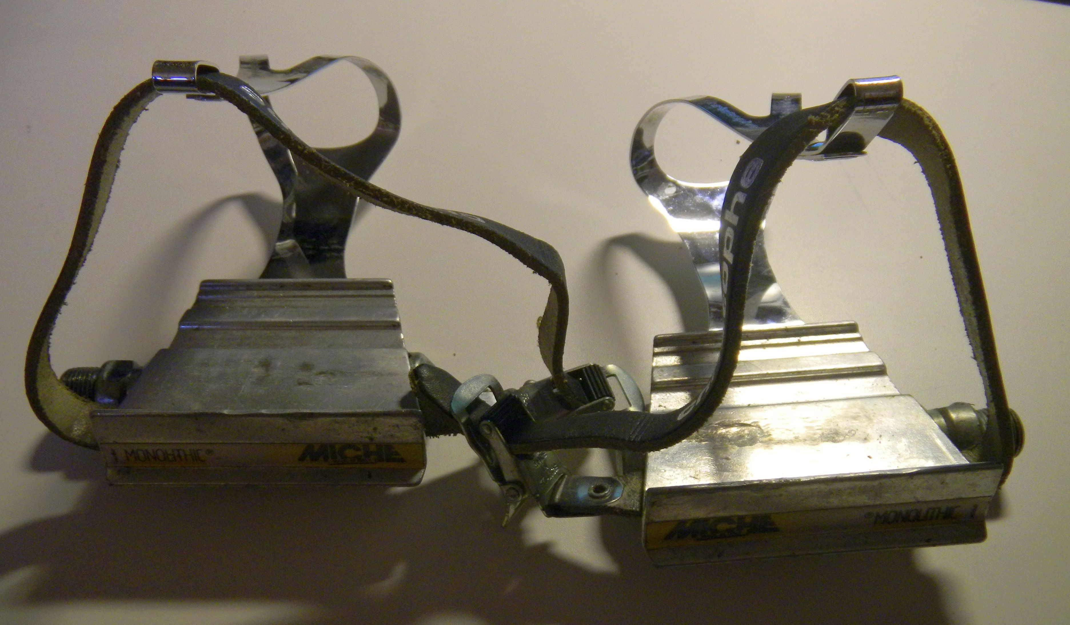 Hier sind ein paar Teile montiert, die ich mal an anderen Rädern angebaut hatte, die mich aber nicht richtig befriedigen. Der Sattel ist ein sehr gut aussehender Selle San Marco Regal mit weiß perforiertem Leder, aber bequem finde ich den nicht (genauso wie den Turbo und den Rolls). Da müsste also vielleicht noch etwas bequemeres in Weiß drauf. Sattelstütze ist die Original Aerostütze von Shimano 6400. Und die Pedale sind von KKT aus Japan, an sich sehr schön, haben aber den Nachteil, dass diese, wie alle alten Rennpedale, nur einseitig fahrbar sind. Von daher sind MKS Stream eine langweilige, aber funktionell gute Alternative.