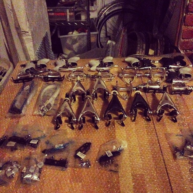Schwarze Croce D’Aune Bremsen in schwarz an einem Pinarello Montello Rahmen. Vermutlich nachträglich bearbeitet. Sehr aufwändig und mit Liebe zum Detail, sogar der Plastikbalg ist in schwarz.