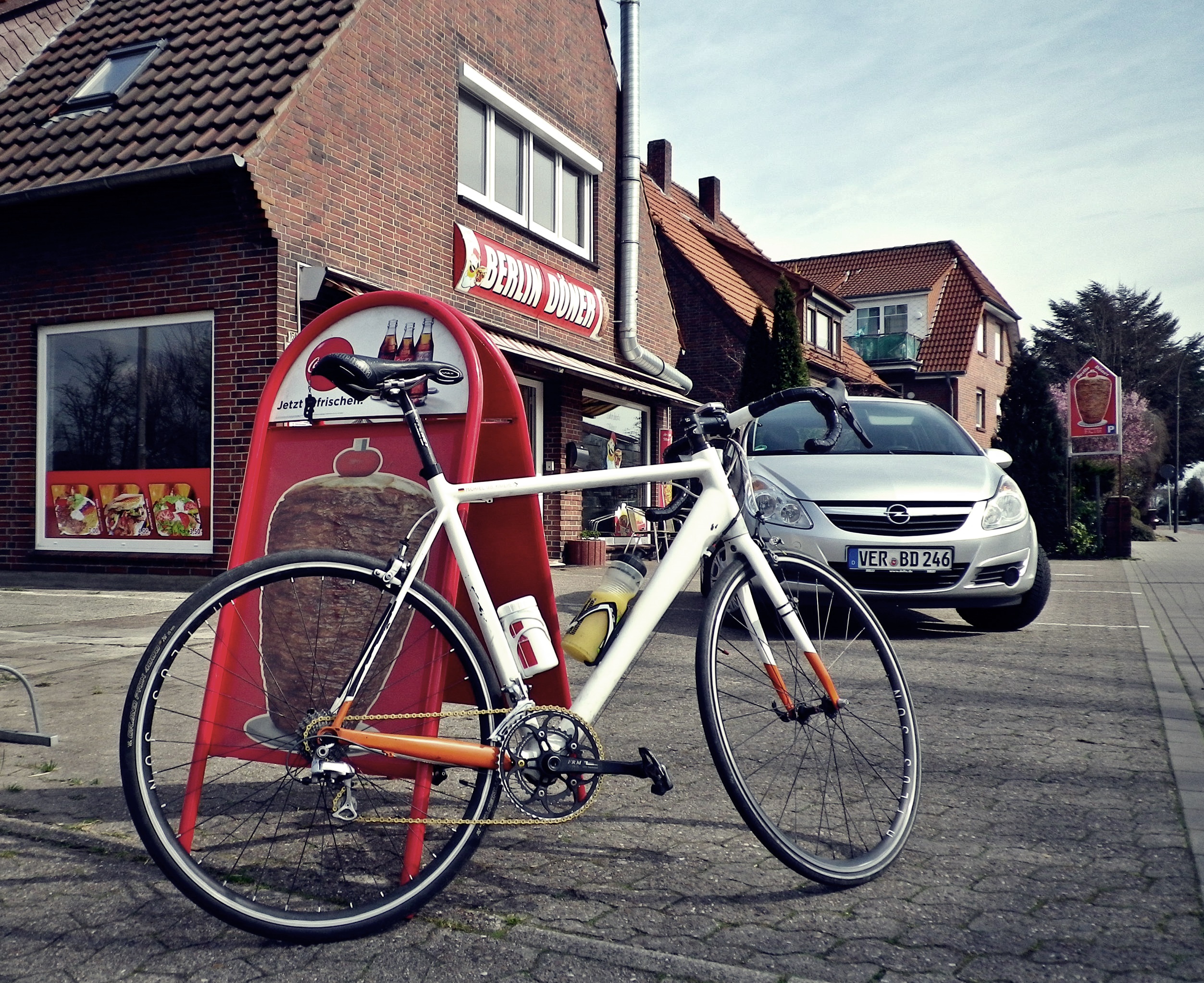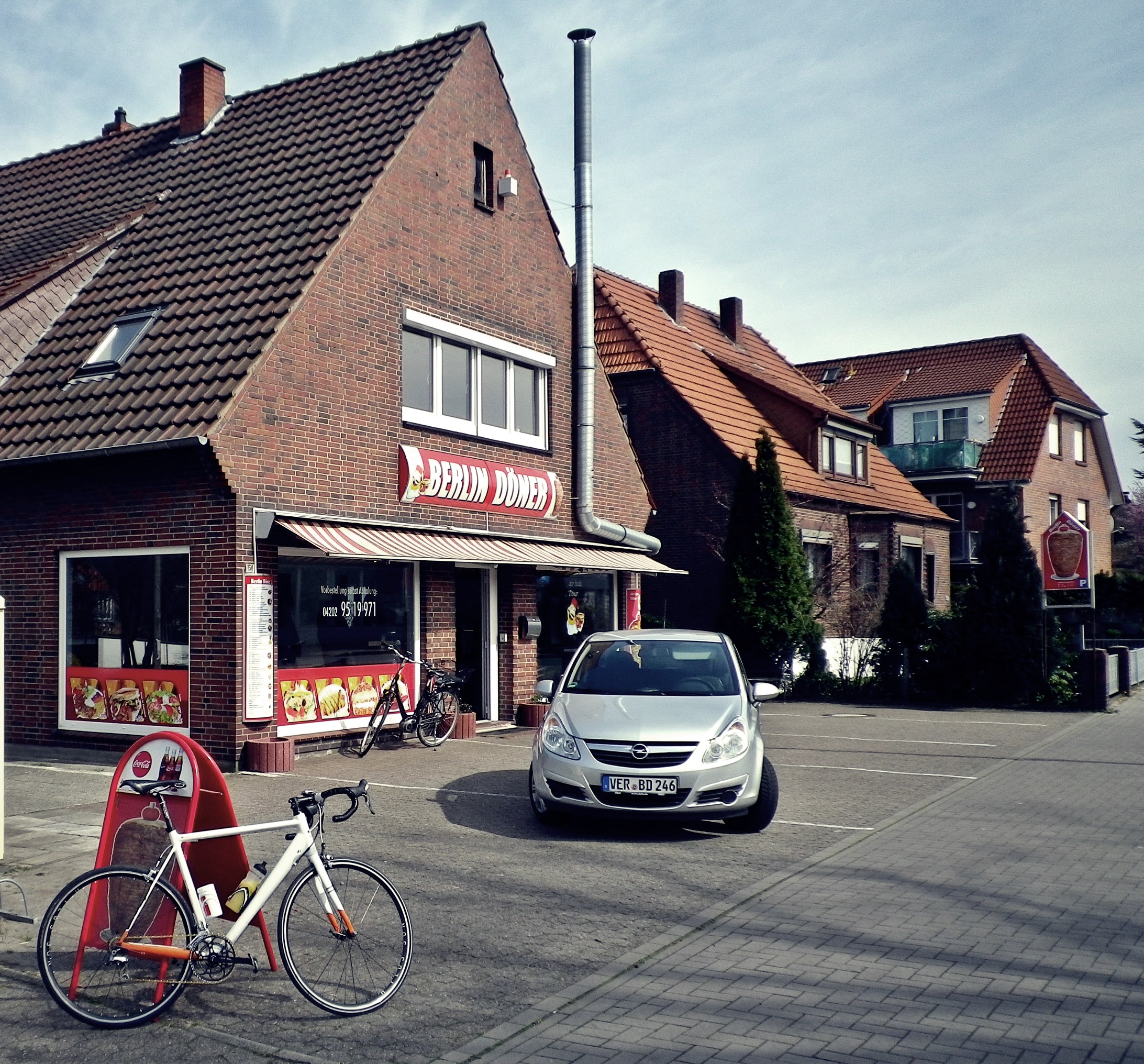 Von Thedinghausen aus geht es mit Rückenwind weiter nach Werder und über die Weser den Uesener Berg hoch. Ich fahre auf halbe Strecke hoch links rein, ich Stück an der Weser aufwärts entlang und die Rampe am Hünenberg hoch. Oben angekommen bin ich fertig und denke: „Wenn ich 15 kg weniger wiegen würde, und ich für jedes Jahraltersunterschied 5 Sekunden früher starten dürfte, würde ich Philipp Lühmann hier locker schlagen.“ Aber jetzt habe ich erst einmal Hunger, denn, wie heisst es so schön „Pain is food, leaving the body“ wenn es um Radfahren geht. Zum Glück gibt es direkt auf dem Gipfel links vom Uesner Berg eines meiner Lieblingslokale, das „Berlin Döner„! Das Berlin Döner kennt an, dass Döner nicht aus der Türkei, sondern aus Berlin kommt, also eigentlich sehr ähnlich zu „Bremen Rollo“. Alleine die facebook Seite von Berlin Döner (Werbespruch: „das beste“) ist schon großartig.