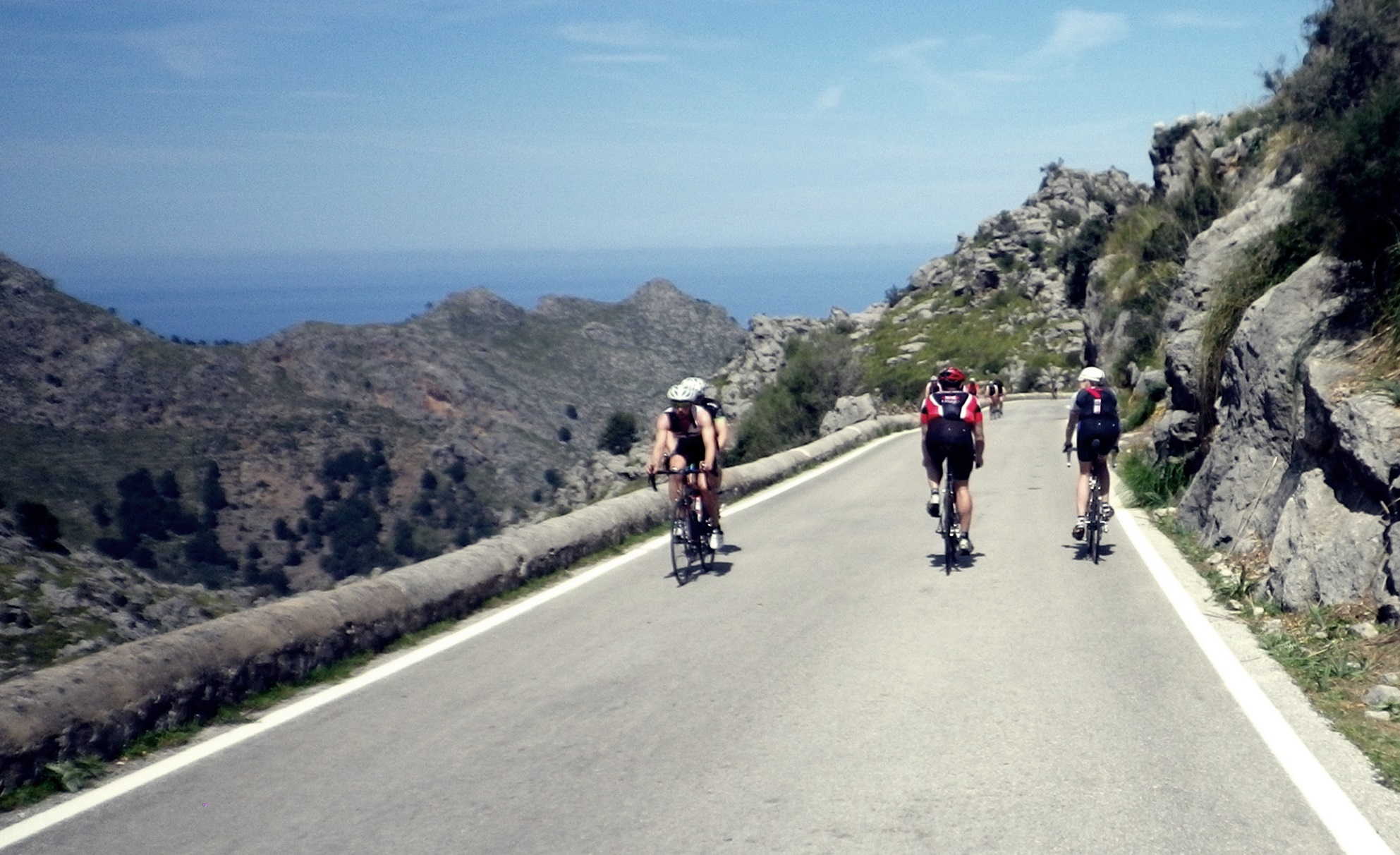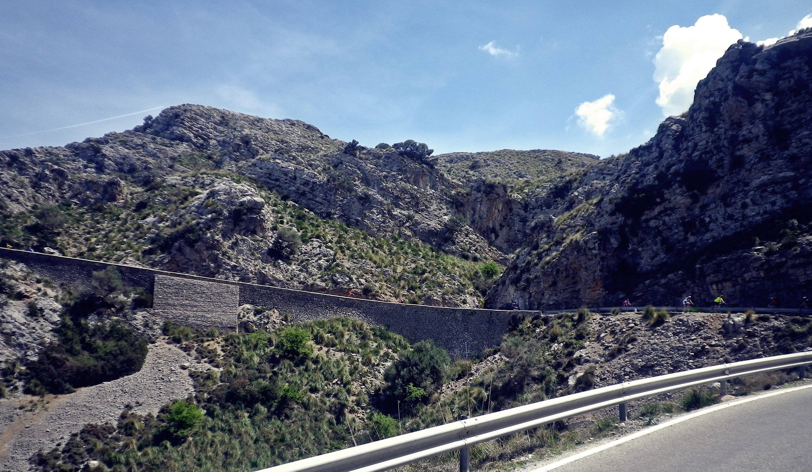 Egal, wir machen und auf den Weg von Pollentia nach Campanet, Selva und Camari, wo der Anstieg in die Transmontana beginnt. Die Sonne scheint, wir sind schnell unterwegs aber ich halte mich zurück, denn das wird ein langer Tag. In Selva lotse ich erst einmal David um den „Kanaldeckel des Todes“; dort fuhr er vor drei Jahren mit seinem Vorderrad rein und das löste eine unschöne häusliche Debatte über seine Dämlichkeit aus.