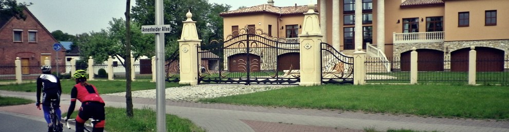 This is a spectacular building that arrived in the completely surprised landscape one day, although the owner tried to compensate the ladnscape by planting some palm trees along the road. For those who haven’t been to Japan yet, this is neither a traditional nor a very modern Japanese building so the only conclusion possible is that this indeed must be the villa of a druglord. When I checked with Google streetview I found out much to my surprise that the building is blurred – which is quite common in Germany but very rare in Japan; another indication that something suspicious must be going on behind its terracotta walls. For years a land rover was parked in front of it, I always assumed that this was the car to make a quick escape as it never seems to have moved. I guess almost every blogpost on the Positivo Espresso and this blog that reports about a ride covering this road has mentioned the druglord’s villa. The location, style and related story of this place seemd to me so particular, that for a long time I thought that this must be special, not to be encountered anywhere else in the world. This was my opinion until entered Delmenhorst the other day. Delmenhorst, a rather unimportant small city to the West of Bremen, home to some very nice people, offers once a year a good touring event. The main point of this tour is, that it doesn’t bother to stay close to Delmenhost for a long time; it rather leads out straight to Colnrade with its beautiful forrests and network of small, sleepy roads. However, when one enters Delmenhorst coming from Bremen, one sees this at the entry to the city.