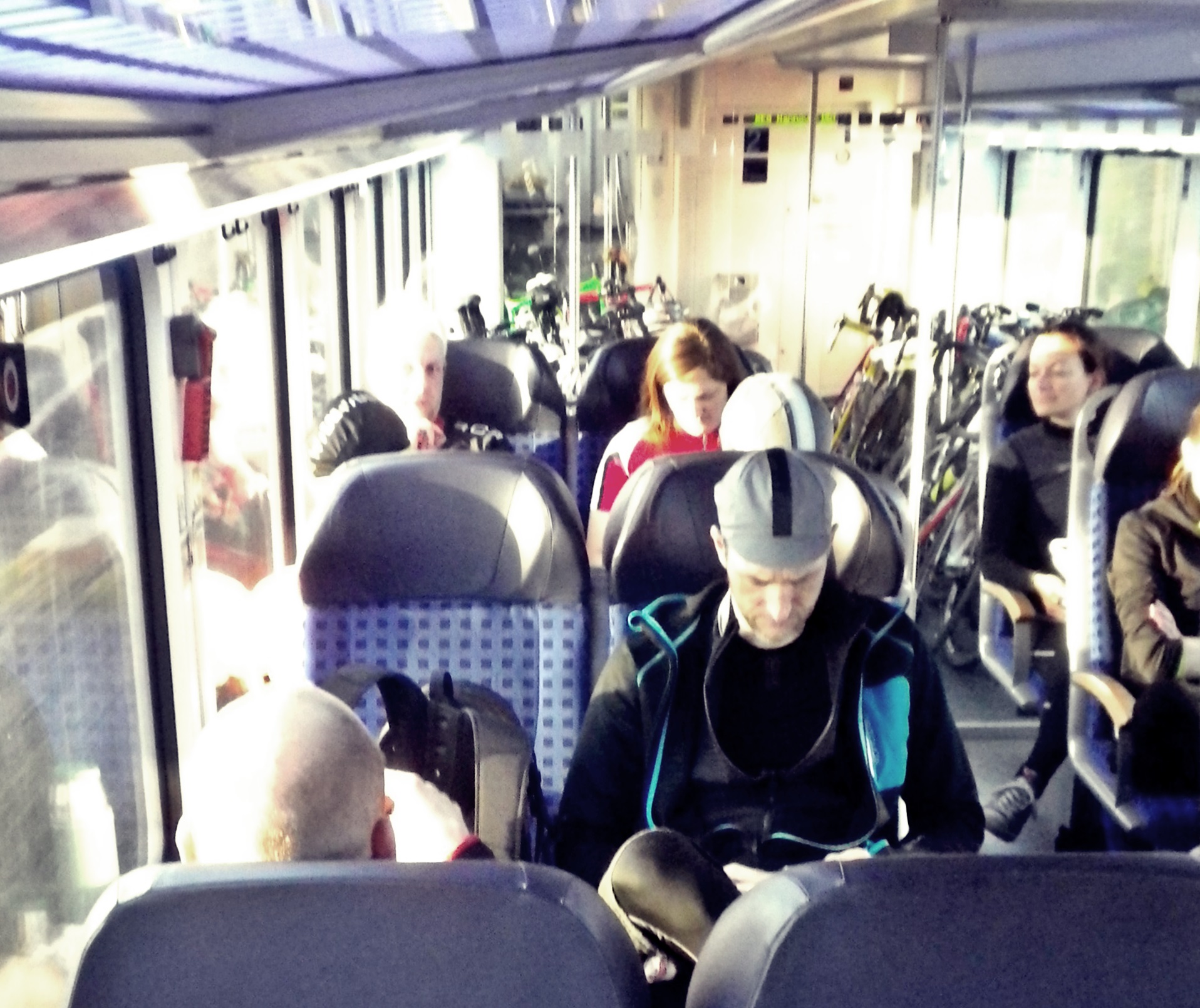 Die Bahnhofsvorhalle wiederum war bevölkert von Menschen, die man grob in drei Gruppen aufteilen konnte: Radfahrer auf dem Weg nach Sarstedt von denen ich auch viele kenne, junge Menschen auf dem Weg von der Clubnacht nach Hause in ihr Dörfchen mit angeschlossenem Bahnhof (Mahndorf, Achim, Verden, etc.), die man nicht kennenlernen muss (es sei denn es handelt sich um die eigene Tochter) und der Bruchteil an armen Schweinen, die an einem Feiertag um 6 Uhr morgens zur Arbeit müssen. Die Radfahrer schienen mir in der Mehrzahl. Es ist eigentlich daher auch unverständlich, warum die rote Fuchs RTF so weit weg in Giesen stattfindet, wenn die gefühlte Mehrheit der Teilnehmer aus Bremen kommt. Da die Radfahrer nicht so aussehen wie die Menschen der anderen beiden Gruppen, werden sie gerne von leicht alkoholisierten Mitgliedern der rückkehrenden Clubtruppe angesprochen („Hey Alter, ich fahr‘ auch Rennrad, ist voll geil, blablbla…“) Diesmal war einer dabei, der wirklich nett versuchte Konversation zu machen allerdings so aussah, als wenn seine Stimmung jeden Moment kippen könnte und wir es dann alle 20 ordentlich auf die Fresse kriegen. Seine Kumpels sahen schon den Ärger heraufdämmern und versuchten ihn von uns zu entfernen, ich lächelte unentwegte und sendete non-verbale Signale der Zustimmung, des Wohlwollens und der „Du bist ja wirklich der Größte – schmacht!“ Art, nur damit die Stimmung nicht kippte. Bis wir dann endlich in den Zug durften. Das Radabteil unten war voll von unserem Equipment und oben sassen wir in Gruppen zusammen, einzelne Plätze zwischen uns besetzt von den Clubbern auf dem Weg nach Hause. Oft mit etwas essbarem in der Hand, und wir hatten schon oft genug gesehen, dass das erst im Magen verschwindet und dann noch ein zweites Mal, mehr oder weniger im Aschenbecher.