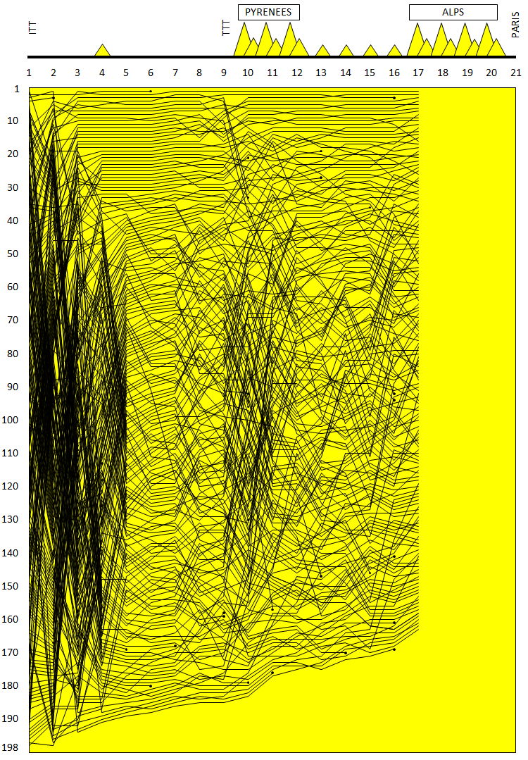 Alle Fahrer,alle Gesamtplatzierungen nach jeder Etappe der Tour de France 2015