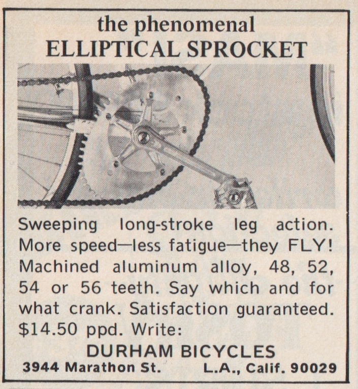 | . . . The Durham elliptical sprocket made similar promises – but also made front shifting impossible. And like other „innovations,“ they were actually an old idea by the 1970s. |