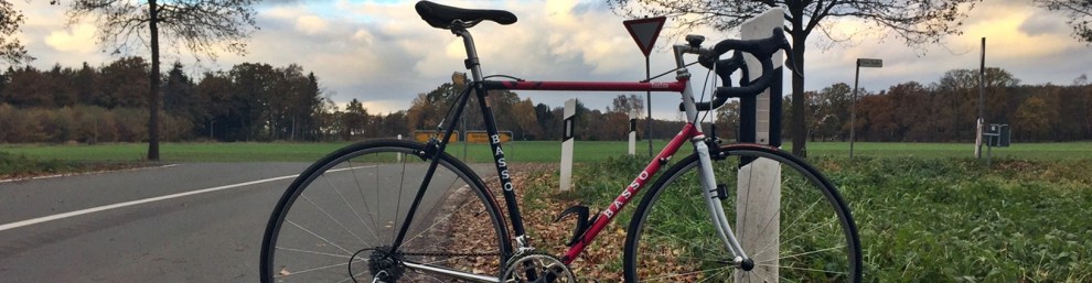 Dann raus in Richtung Süden. Ich bin echt lahm. Auf dem Deich treffe ich einen anderen Radfahrer auf einem roten Cinelli Supercorsa; zunächst fahre ich hinterher. Thomas, Philipp und noch ein paar andere kommen wir entgegen. Ich erkenne sie erst im letzten Moment und höre nur noch „hey mob…“. Über Weyhe geht es in Richtung Barrien. Vor mir biegt jemand von links auf den Krusenberg ein. Der ist schnell, ich schaffe es am Berg nicht aufzuholen. Aber auf der Geraden in Richtung Golfplatz komme ich näher und schließlich fahren wir gemeinsam durch den Wald runter nach Syke, wo sich unsere Wege wieder trennen.