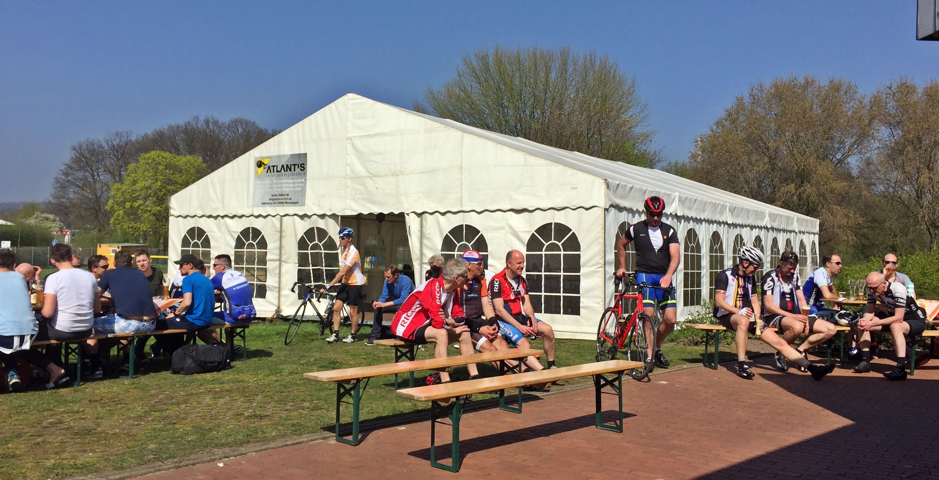 Wir kamen an, zogen uns fast nackt aus, denn mittlerweile waren die Temperaturen in zweistelligen Bereichen, zahlten die lächerlichen 8 € Startgeld und konnten uns gleich auf den Weg machen. Das war eben nicht die typisch norddeutsche RTF: Wenn, sagen wir mal in Delmenhorst, zwischen 8 und 9 gestartet wird, dann steht das gesamte Feld um 8 Uhr am Start und sprintet los, als wenn das Ziel gerade mal 250 Meter entfernt wäre. Kommt man im 9, kann man so eine RTF quasi komplett einsam, alleine und verlassen zurücklegen, man trifft höchstens ein paar aus dem Feld Herausgefallene und Pannenkünstler, die ihr Schicksal am Straßenrand lamentieren. Nicht so in Holland. Verzeihung, in Ibbenbüren: Hier ging immer noch ab und an ein Grüppchen auf Reisen und die Rezeption im großen weißen Zelt war auch noch offen. Überhaupt, die Holländer, da muss jetzt doch noch einiges zu gesagt werden. Zumal bei der RTF wirklich nur Holländer waren, außer uns Vieren und Maik.
