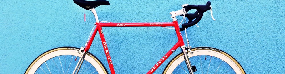 Das De Rosa Giro d’Italia kam Mitte der Neuziger Jahre auf dem Markt und wurde nur einige Jahre produziert; den Rahmen gibt es in verschiedenen Farben und in verschiedenen Versionen mit Columbus Neuron und EL Rohren, sowie „normaler“ und Unifork. Klassisch würde man den Rahmen vielleicht mit einer Campagnolo 8-fach Gruppe und einem Shamal Laufradsatz bestücken. Hier und hier sind ein paar schöne, klassische Exemplare zu sehen. Alle Farbschemen sind sehr nett anzusehen, da ich aber noch nie ein roter Rad besessen habe gefällt mir dieses klassische De Rosa / Pinarello Feuerrot sehr gut.