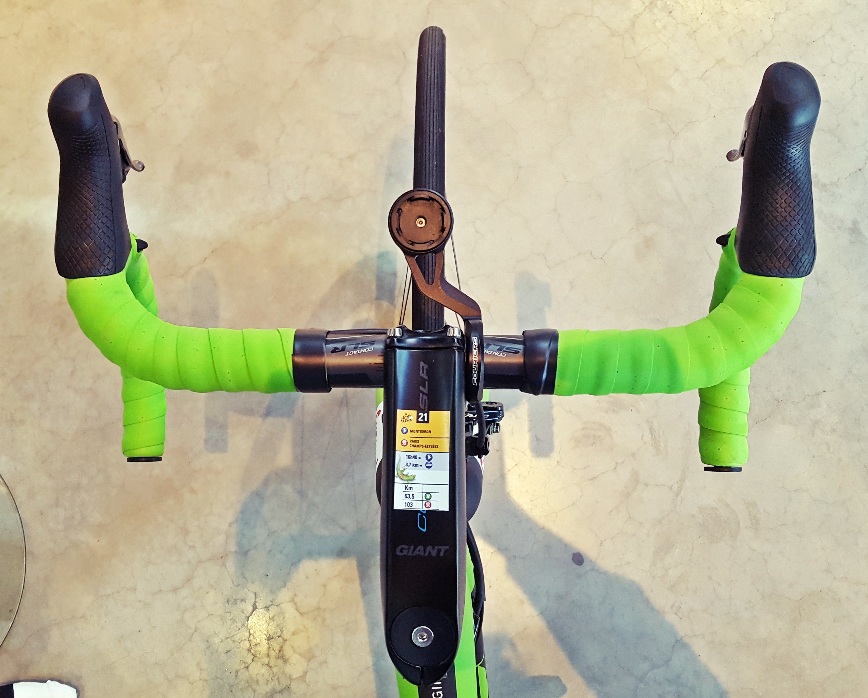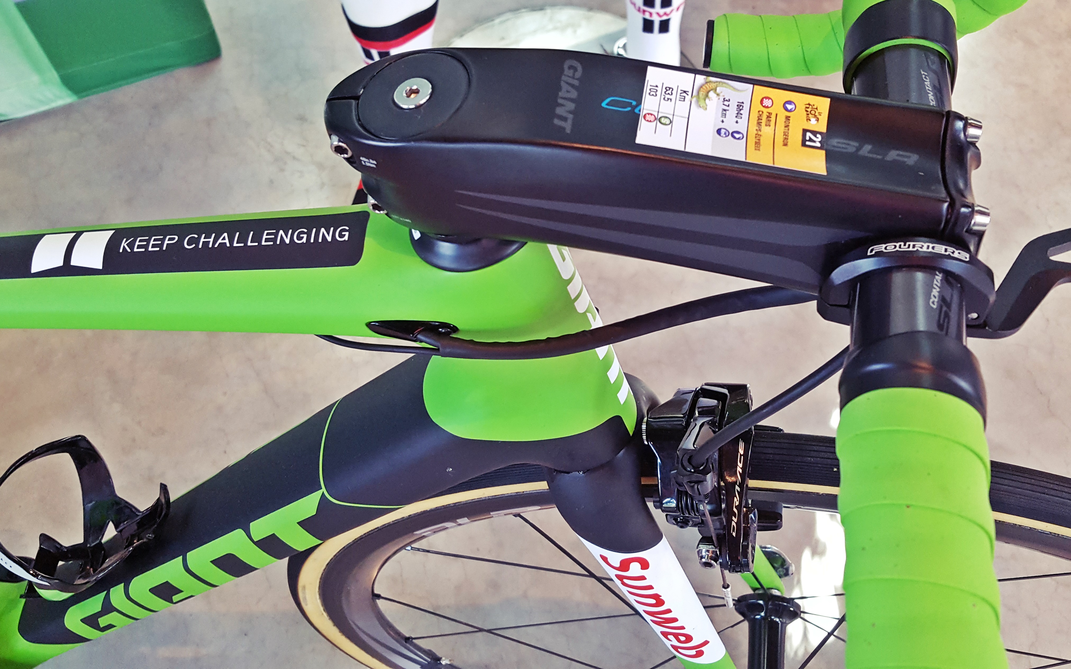 Das TCR (sozusagen das „normale Rennrad“ von Giant im Gegensatz zu dem Propel (Aero) und dem Defy (Komfort)) von Warren Barguil, dem Gewinner der Bergwertung der Tour de France war ebenfalls da. Auch als leichter Bergfahrer wird ein massiver Vorbau montiert auf den Thomas Voss neidisch wäre.