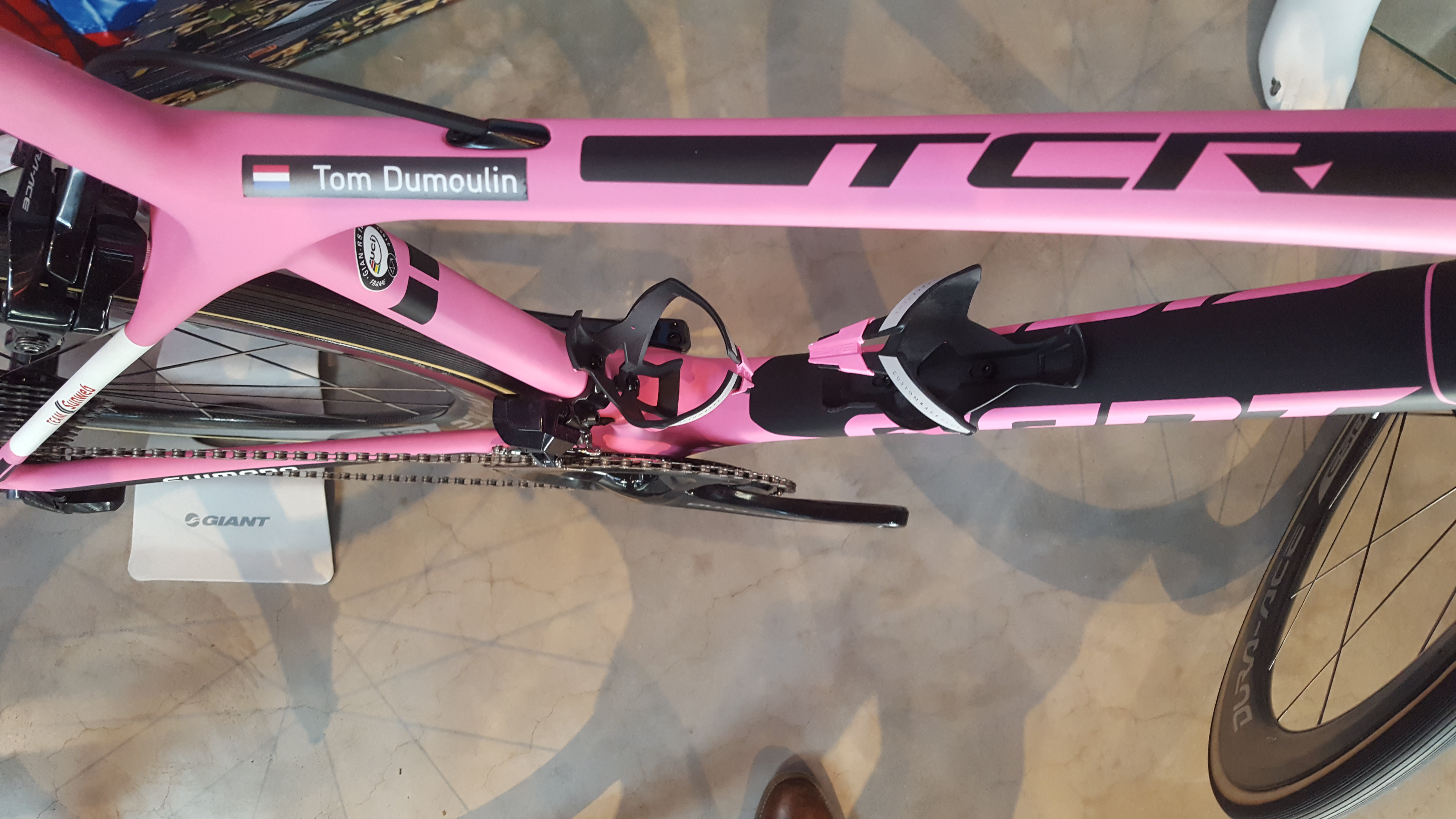 Dies hier zum Beispiel ist das TCR von Tom Dumolin, dem Gewinner des Giro d’Italia 2017. Es sieht aus wie ein normales TCR Rad für Frauen in Pink. Irgendwie so ein bißchen schwul im positiven Sinne.
