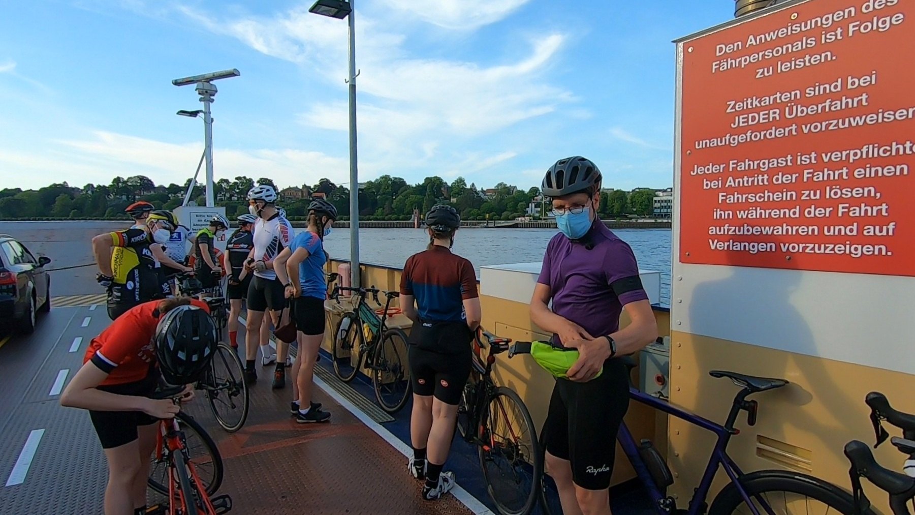 Die Strecke der Club Rides wird jedes Mal variiert – meist geht es Richtung Blockland, manchmal aber auch auf die andere Seite der Weser, oder in den Süden. Am letzten Donnerstag fuhren zwei Gruppen auf der linken Weserseite entlang der Deichverteidigung nach Lemwerder und setzten mit der Fähre hinüber nach Vegesack. Dort machten wir Pause bei Udo, der die Sommerterrasse des VRV (Ruderverein Vegesack) betreibt, bevor wir über die Lesmona Wellen nach Hause ballerten.