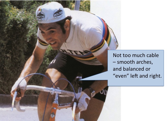Not „too much“ cable! If the cables exit from the top of the brake levers, as opposed to aero routing under the bar tape, then there should not be huge loops of cable springing up over the bars. Enough for a smooth arch, and enough that the cables don’t bind when the bars are turned or the brakes are applied. Also, it just looks „right“ if the arches of cable on the left and right are balanced. It can help to start with the front cable — get a smooth arch from the lever to the brake caliper, passing up and over the bar. Then get the rear cable to match the size/height of the arch up front – cross the cables behind the bars – then work on the arch at the rear of the bike too. Again, smooth, not too much cable. It should exit the rear cable guide gently in a continuous arc. Too long, and there will be double curves. Too short, and it will pull or bind when the rear brake is applied.