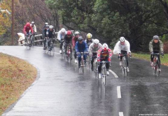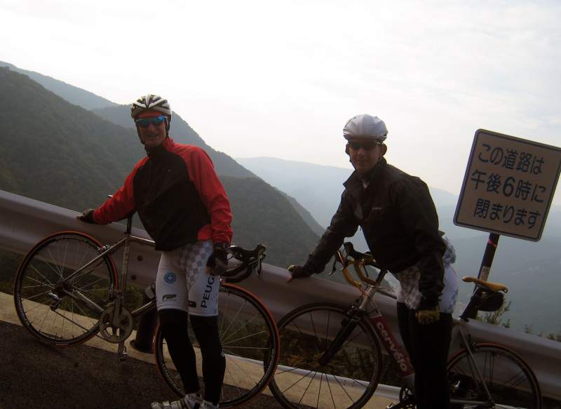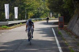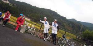 The town of Shiobara was still very quiet and no local townsfolk were on the streets yet. However from all corners, backyard alleys and manholes, cyclist were gathering on the main street and silently proceeding to the start. Tom and me were lucky to find two riders from NALSIMA FRENDS [Yes, this is what they had written on their jerseys], who rode rather fast and gave us the chance to draft effortlessly along.