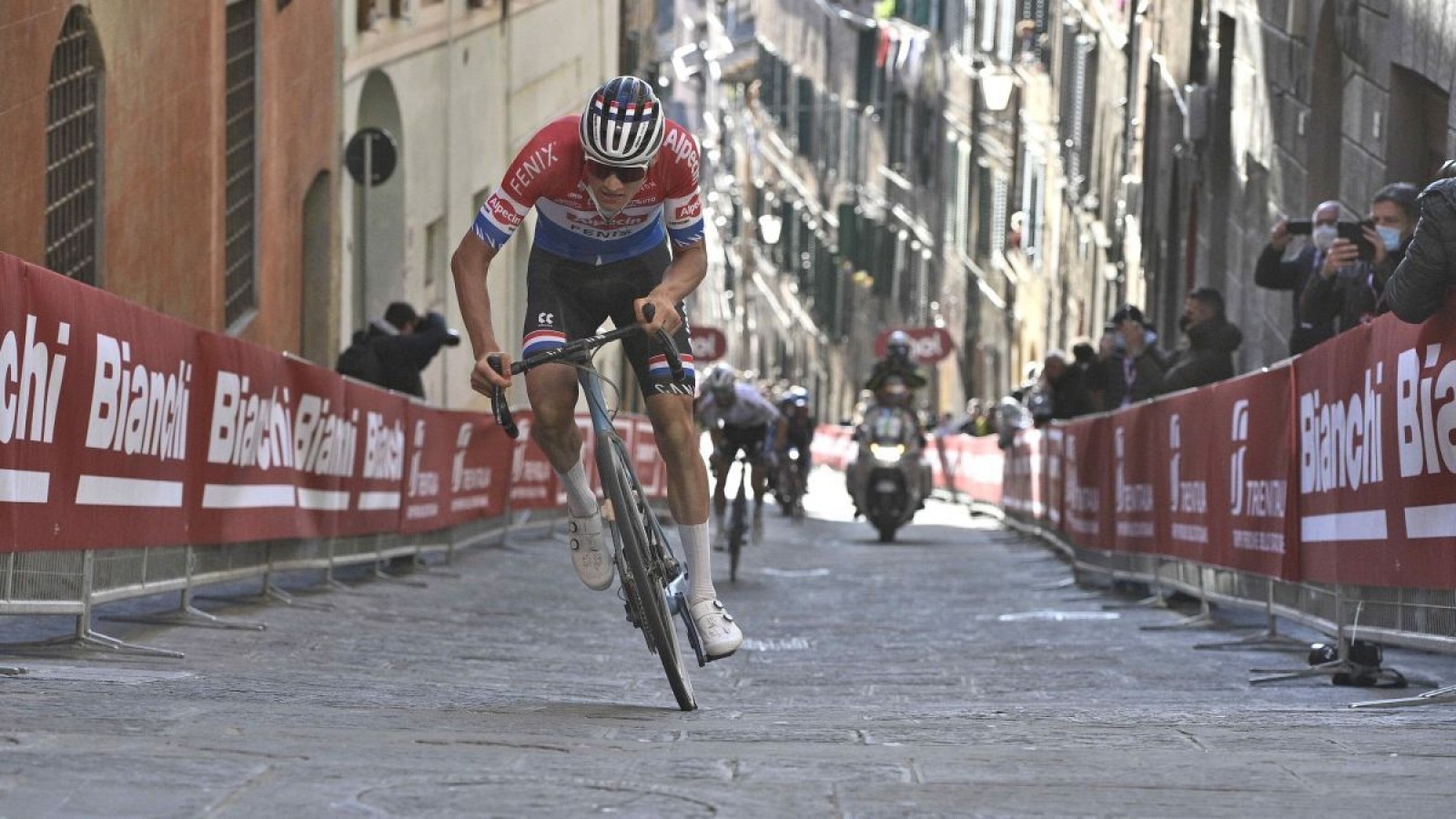 Dieses hier ist keine Überraschung. Der Radsport hat wieder echte Stars und ganz vorne steht das Mathieu van der Poel. Das Foto zeigt ihm am finalen Anstieg an der Via Santa Caterina in Siena. Pure Kraft und Dominanz im Superheldenstil.