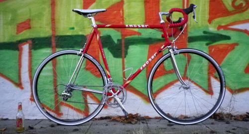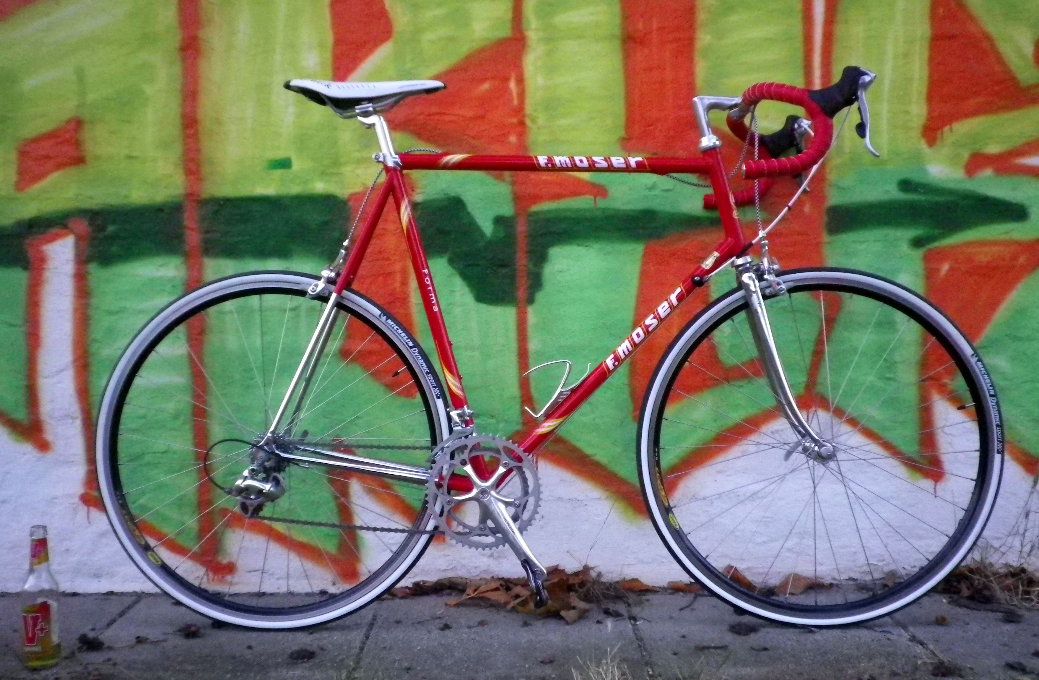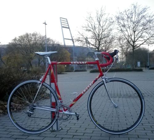 Moser Forma Rahmen heute endlich fertig aufgebaut und probe gefahren am Weserstadium. Wird in den nächsten Wochen seinen neuen Besitzer, Shozo in D erreichen. Fährt sich flott – mit 63 cm ist der rahmen aber auch etwas zu groß für mich. Der Aufbau war unproblematisch, da hat alles gepasst. Leider gab es nur etwas Ärger mit dem Verkäufer der Shimano Ultegra 6510 STIs, von denen der rechte nicht funktionierte.