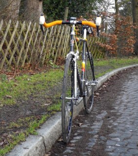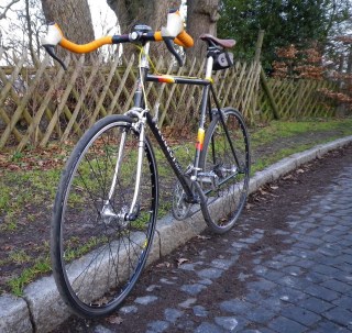 Ich hatte die Idee da Rad mit Shimano Golden Arrow Komponenten, den gedanklichen Vorläufern der heutigen 105er Gruppe, aufzubauen. Ich mag einfach diese goldene Pfeilprägung in den Komponenten, dass sieht spitzenmässig aus für meinen Geschmack. Mühsam kaufte ich mir Umwerfer, Kurbel, Schaltwerk, Rahmenschalthebel und Bremsen auf Ebay zusammen. Bei dem Sattel entschied ich mich für einen sehr schicken Charge Spoon in braun. Bei dem Lenker wollte ich es besonders gut machen und wir den Traum von einem Bullhorn Track Lenker erfüllen. Die Kabelverlegung war dann so schweirig, dass ich das gar nicht allein hinbekommen habe, ein schönes weißes Lenkerband versaute und dies meinen Radhändler machen ließ. Das Lenkerband war noch einmal orange, aber damit neigte ich meine orange Phase auch dem Ende zu.