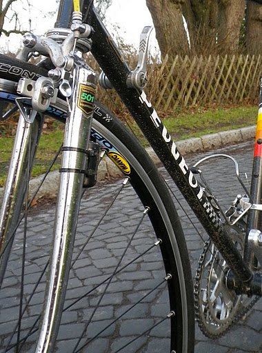 Durch den Aufbau hatte ich eine Menge Dinge gelernt. So wusste ich zum Beispiel vorher nicht, dass Schaltzüge und Bremzüge unterschiedliche Durchmesser (1,2 und 15,mm) und Hüllen (4 mm und 5 mm) haben. Und und und. Danach begann eine kurze Phase der sogenannten „Eprochengerechtheit“, also der zeitlichen Abstimmung von Rahmen und Komponenten. Das ist nun zum Glück wieder vorbei, wie eine lästige Erkältung. Golden Arrow Bremsen sind halt, wie auch alle anderen Bremsen aus dieser Zeit echt Mist. Mit den Shimano 105er wird das erträglich aber die erste moderne Bremse der Welt war iegntlich die Dura Ace 7403, weil Dual Pivot System. Auch Bremshebel ohne Rückholfeder sind nicht so doll habe ich gelernt.