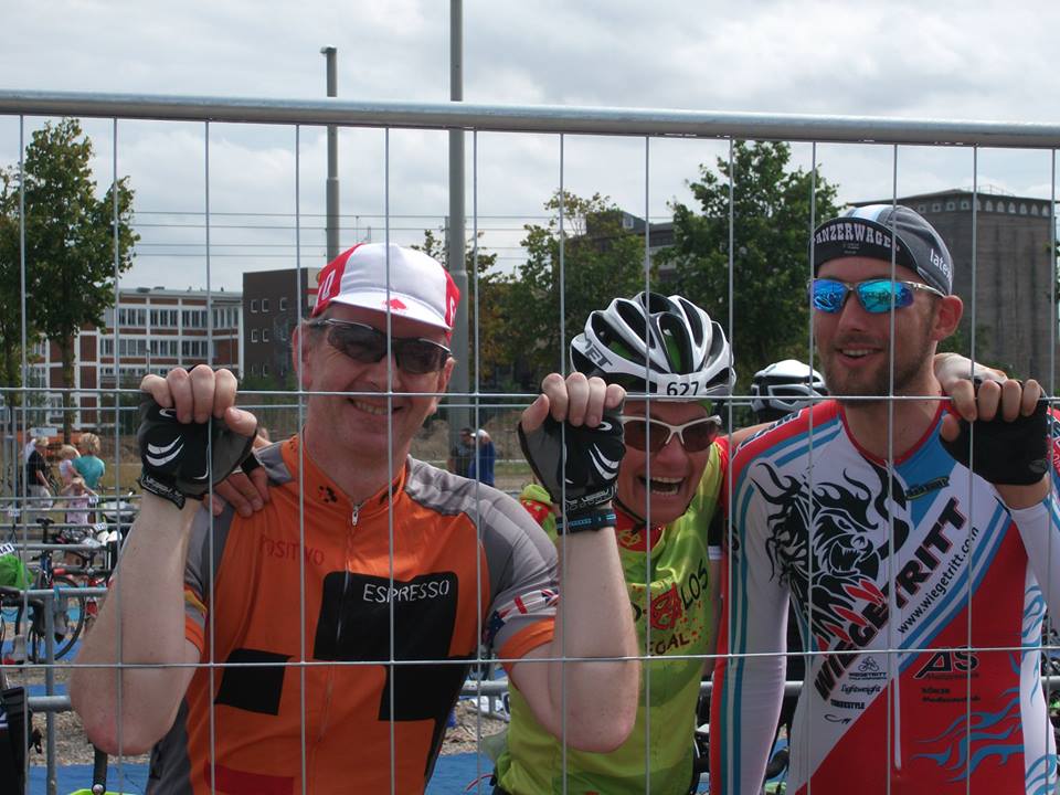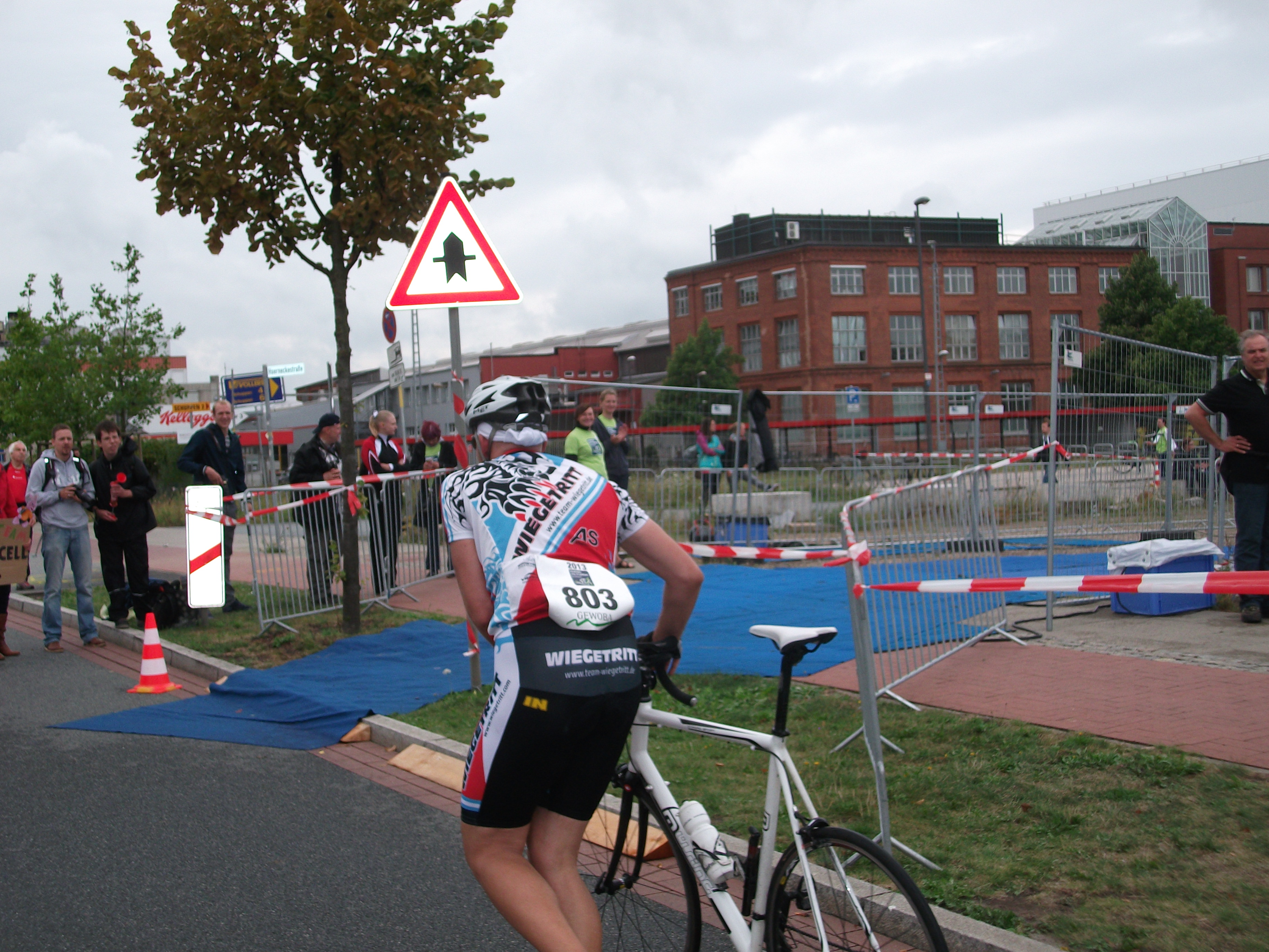 Selbstverständlich war heute wieder die gesamte Elite des Rad- und Triathlonsports in Bremen entweder am Start oder wenigstens anwesend. Silvia, Silke und Ina waren wieder als Frauenstaffel dabei, Thomas, Björn und Andres starteten in der Männerstaffel, Tobi und Matthias waren mit ihren Firma unterwegs und daneben sah ich auch noch Jessica, Harald, Marc, Maren, Tim, Schnippo, Bernd, Hans-Peter, Andi, Fr. Holzberger, Elena und dieses kleine Mädchen, dessen Name mir jetzt partout nicht einfallen will. Nicht dabei war diese Frau von Urania Delmenhorst, die letztens bei der Ankunft in der Wechselzone beim Silberseetriathlon erschöpft zusammenbrach und so etwas wie spontane Wehen oder einen sehr überraschenden Orgasmus entwickelte. Während ich so überrascht war, dass ich das fotographieren vergaß, stellte ich heute fest, dass es ja doch ein Foto von ihr in den Untiefen des Netzes gibt: