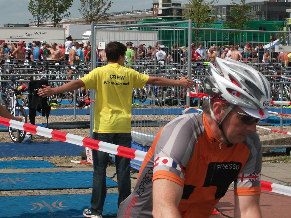 Dann ging es auch schon los. Peggy-Maria war bereits im Wasser und Ronni Francois und ich warteten auf sie in der Wechselzone. Der erste Schwimmer kam bereits nach weniger als acht Minuten aus dem Wasser und so langsam füllte sich die Wechselzone. Es gab das übliche Chaos und Geschreie denn der eine oder andere steht ja da immer irgendwie im Weg um. Wir hatten uns ganz am Ende der Zone platziert, etwa drei Meter von dem eigentlich Radplatz entfernt. Peggy kam an, schaute auf den Platz und sah uns nicht, obwohl wie wie blöd „Peggy – hier!“ schrien. Der Ausdruck auf ihrem Gesicht, diese Mischung aus Erschöpfung und Verzweiflung war schon etwas ganz besonderes. Ich denke in diesem Moment war sie kurz davor sich irgendein Rad zu schnappen und alleine weiter zu fahren, wenn sie bereits alle Männer im Stich gelassen hatten.