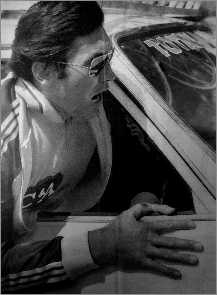 Eddy Merckx (C) smiles as he does a victory lap along with Frenchman Raymond Poulidor (left) and Spaniard Vicente Lopez-Carril (right) at the end of the Tour de France, 21 July 1974 in Paris. Merckx won the last stage between Orleans and Paris to tie the record of eight wins in one Tour and captured his record-tying fifth Tour de France. Poulidor, at age 38, finished second and Lopez-Carril, third.