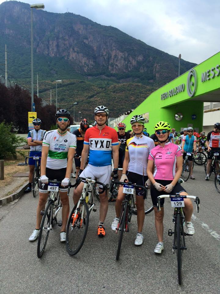 Für die restlichen 28 km bis zur Messe in Bozen, entlang der Eisack auf dem schönen Radweg war dann noch einmal eine Stunde fällig, so dass ich ziemlich genau eine Stunde nach dem Start am Start war. Statt den regulären Kurs gegen den Uhrzeiger über Eppan, Kaltern und Auer nach Steinmannwald zu fahren, fuhr ich einfach mit dem Uhrzeiger über St. Jakob nach Steinmannwald, wo ich ziemlich pünktlich gegen 9 Uhr ankam, kurz vor dem Feld. Ich fuhr die brutale Steigung vor dem Rennen hoch und wartete auf die anderen Bremer. Kurz danach kam Silke rein, direkt neben der „fucking perfect“ Russin, heute beide in Ale Klamotten gekleidet.