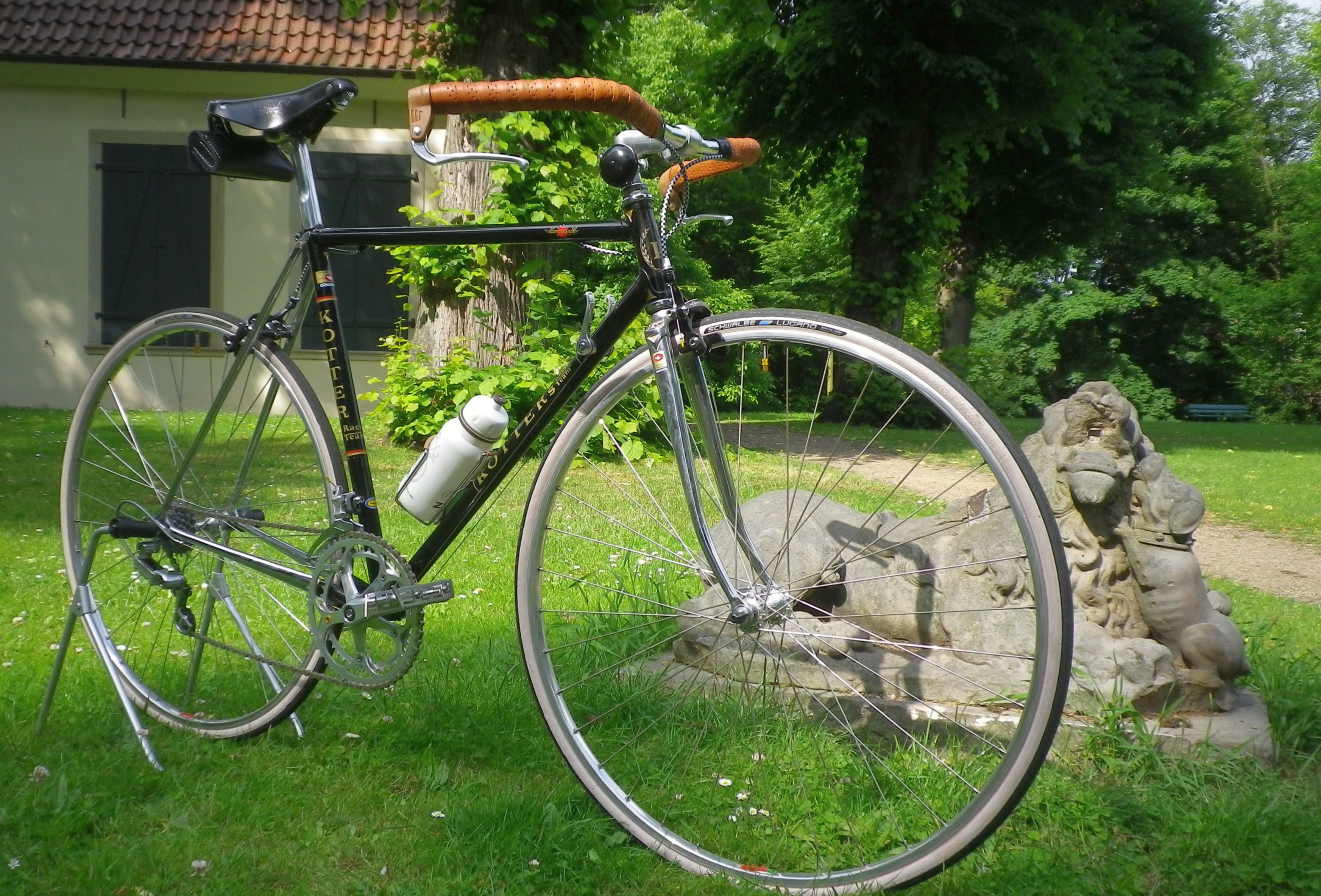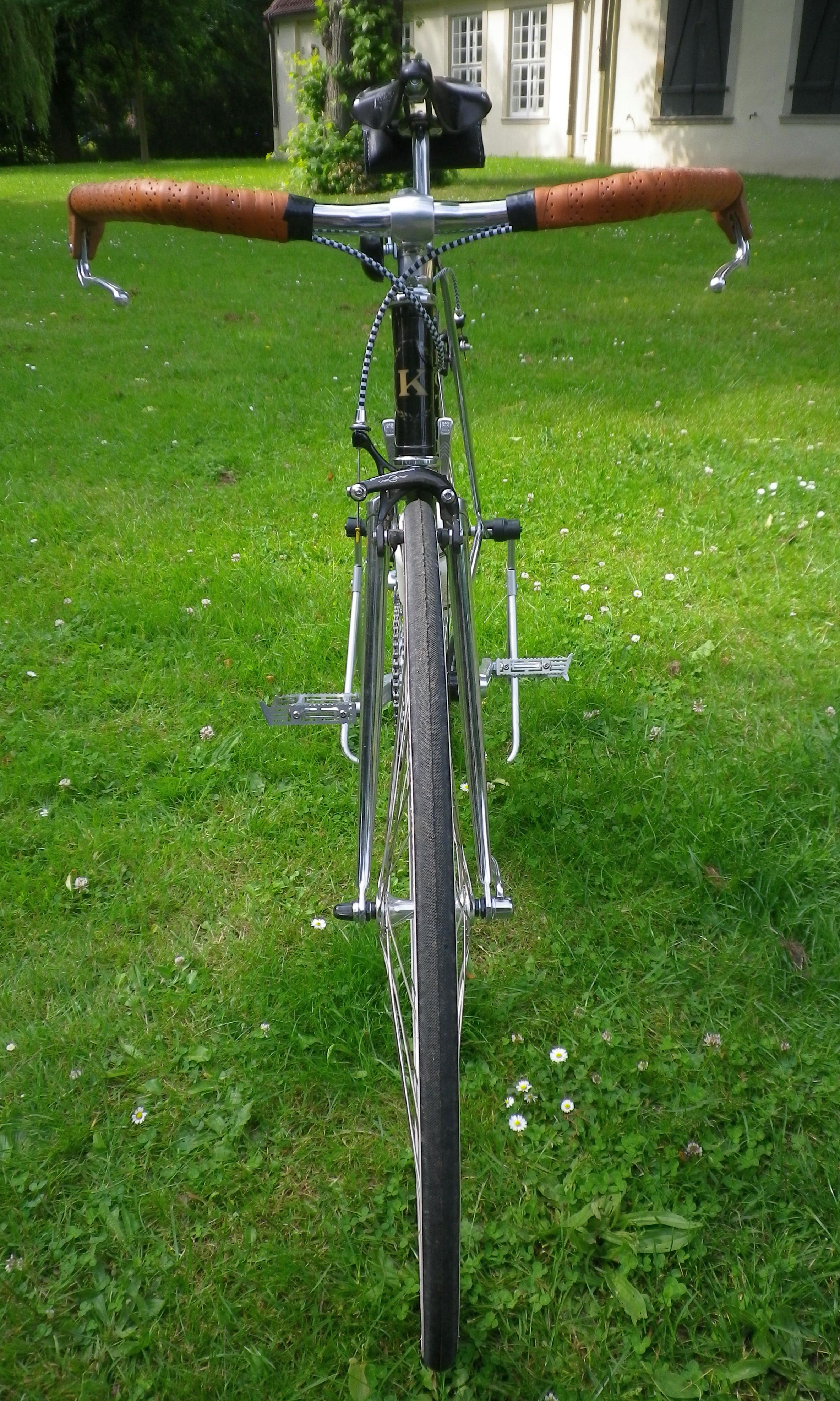Es ist eine schöne Überraschung geworden und fährt sich mit kurzem Vorbau und Lenker sehr angenehm. Der Sattel muß noch weiter runter, aber darunter ist eine NOS Shimano 600 Sattelstütze und die tut man ja nicht so gerne weiter als notwendig in den Rahmen schieben. Der Brooks steht vorne etwas hoch, habe ich ausprobiert, ist so am bequemsten.