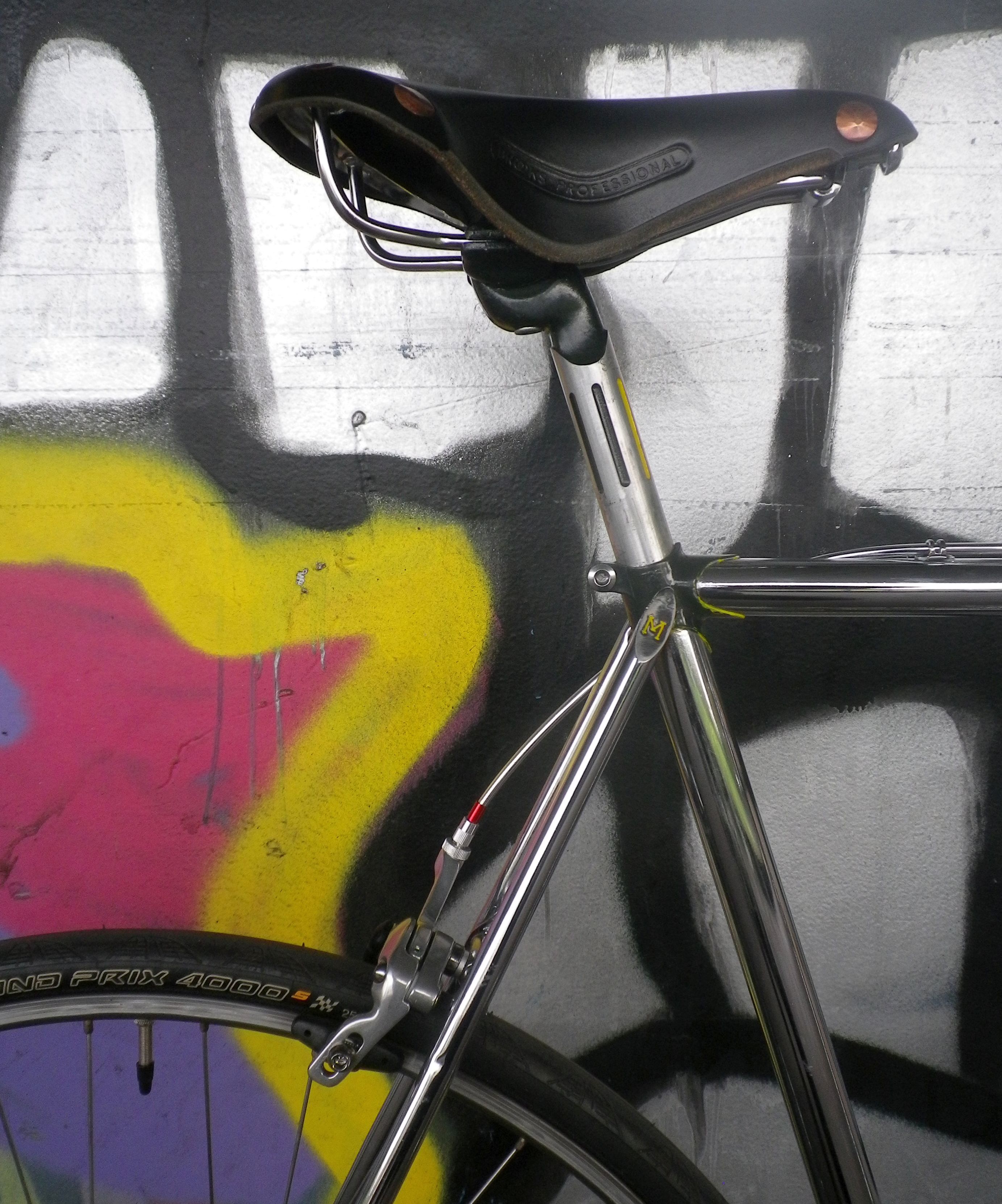 Cooler Brooks Sattel mit Kupfernieten und weniger coole Miche Performance Bremsen.
