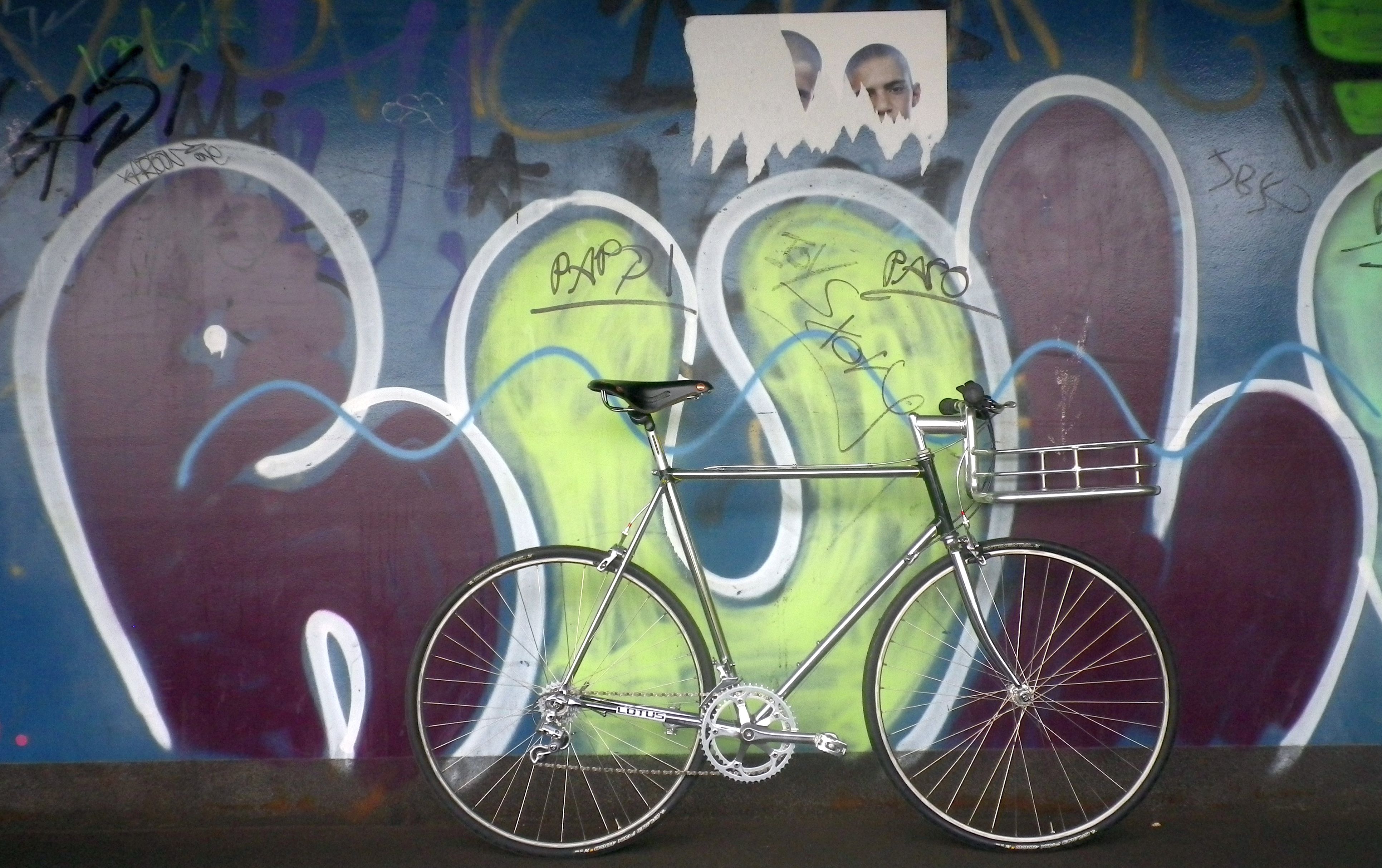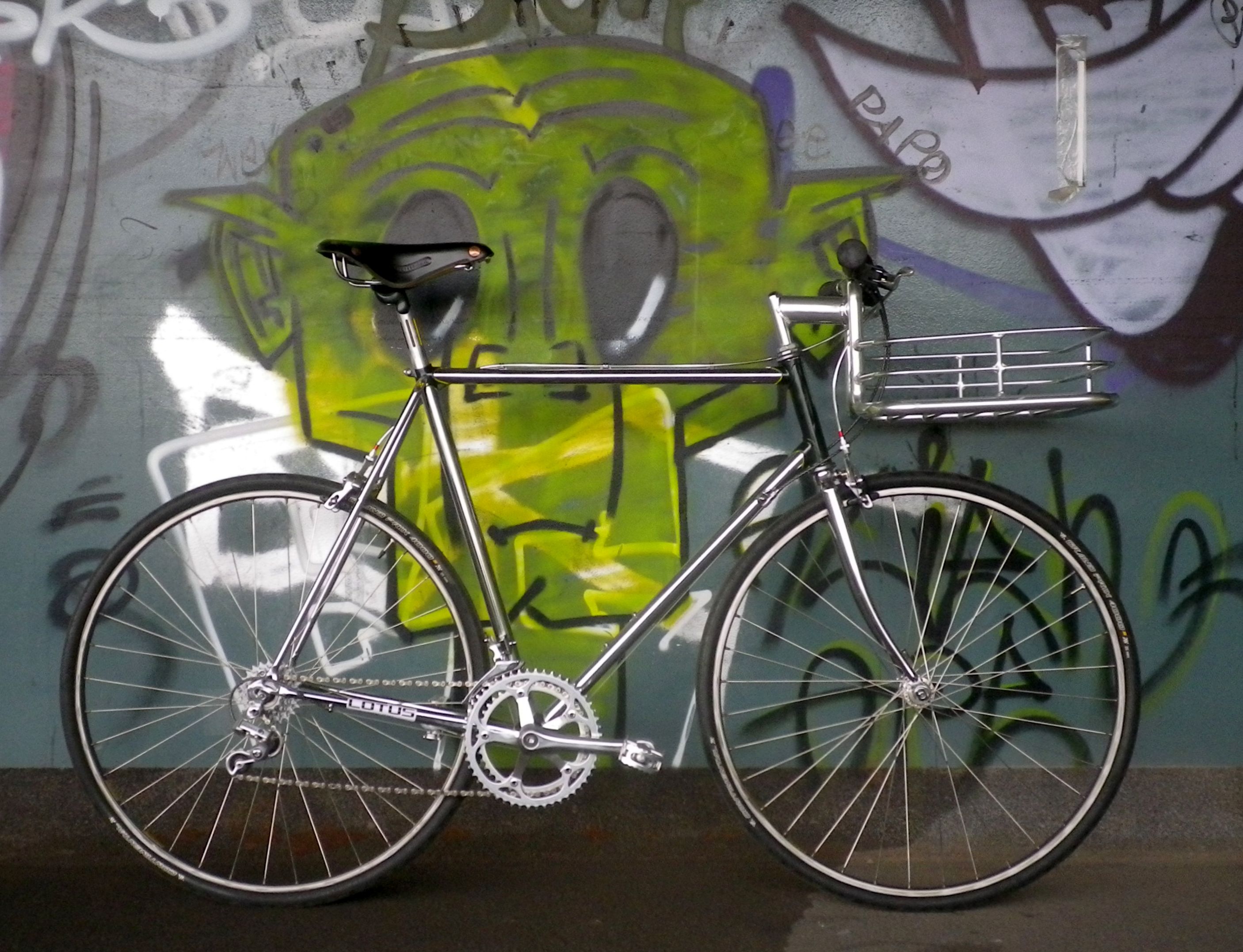 Die Basis dafür ist ein belgischer Minerva Rahmen, vermutlich aus den Neunzigern, komplett unterverchromt und mit Schutzblechösen den Tobias und ich mühsam vom Lack befreit und dann lackiert haben. Daraus habe ich dann ein Rennrad gebaut, angelehnt an Designideen von Lotus Racing, das sehr schick aussah aber keinen Spaß zu fahren machte. Vermutlich weil das zu dick aufgetragen war.