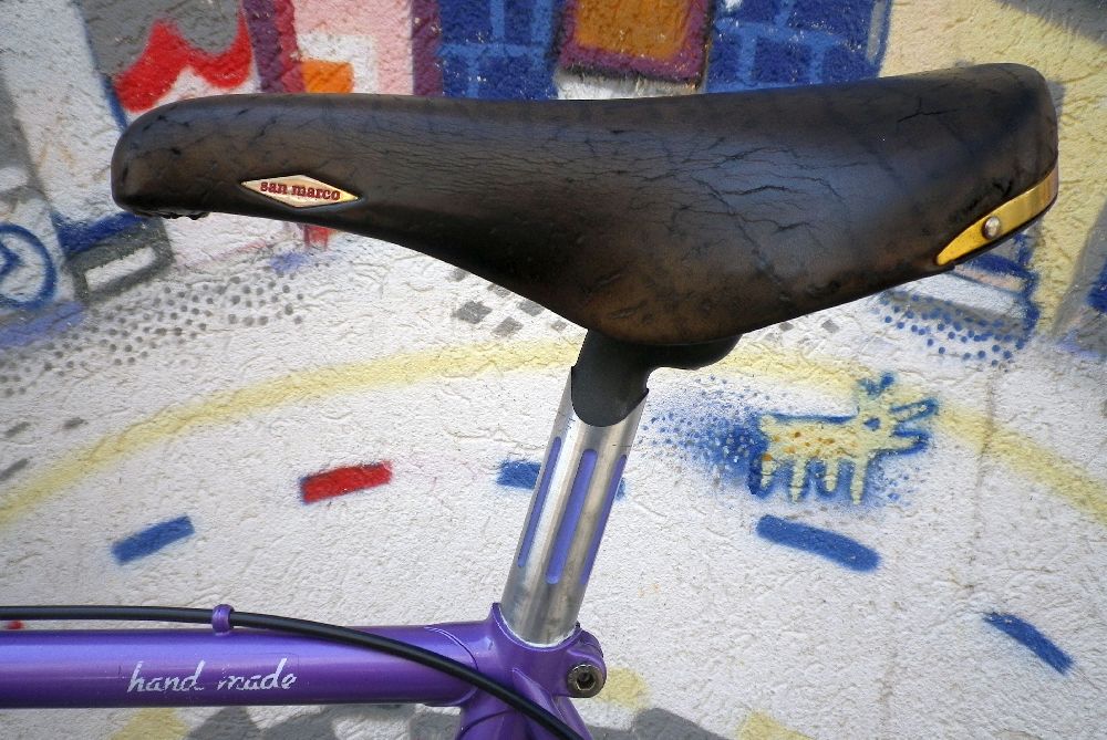 Um dem ganzen Rad etwas Indvidualität zu veleihen, hatte ich die Aussparungen in der Sattelstütze farblich passend lila angemalt.Zudem ist eine der Kettenblattschrauben in Gold, das hat sich im Laufe der Zeit als Markenzeichen für die Räder die ich aufgebaut habe entwickelt.