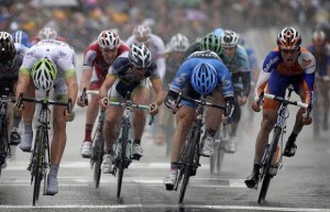 In Hannover waren wir nun schon in der Stadt, fuhren an so einem See oder so vorbei und ich hatte keine Ahnung wie weit es noch sein würde. So langsam machte ich mich aber an die Spitze. Das Feld wurde nervöser und die Geschwindigkeit auch höher. Ich dachte schon, dass ich auf der Zielgeraden wäre, aber dann gab es noch mal eine Rechtskurve. Die führte in eine Straße, auf der ein Teil der Fahrbahn durch Hütchen etc. abgesperrt war, und zwar auf der Außenseite der Kurve. Ein Fahrer, ca 10 m vor mir, war zu schnell in die Kurve gefahren, fuhr zwischen zwei Absperrungen durch in den abgesperrten Bereich und bei dem Versuch wieder auf die Strecke zurück zukommen fuhr er in eine der Absperrungen. Dabei überschlug er sich, krachte auf den Asphalt und fing sehr,s ehr laut an zu wimmern. Der Polizeiwagen, der vor unserer Gruppe fuhr hatte das irgendwie mitbekommen und hielt mitten auf der Strecke an. Das führte dazu, dass einige Fahrer in den Wagen hineinfuhren und das ganze Feld fast zum stehen kam. Bis ich mich da vorbeigemogelt hatte, war die Spitze des Feldes bereits weg und der Sprint entschieden. Aber immerhin heil angekommen.