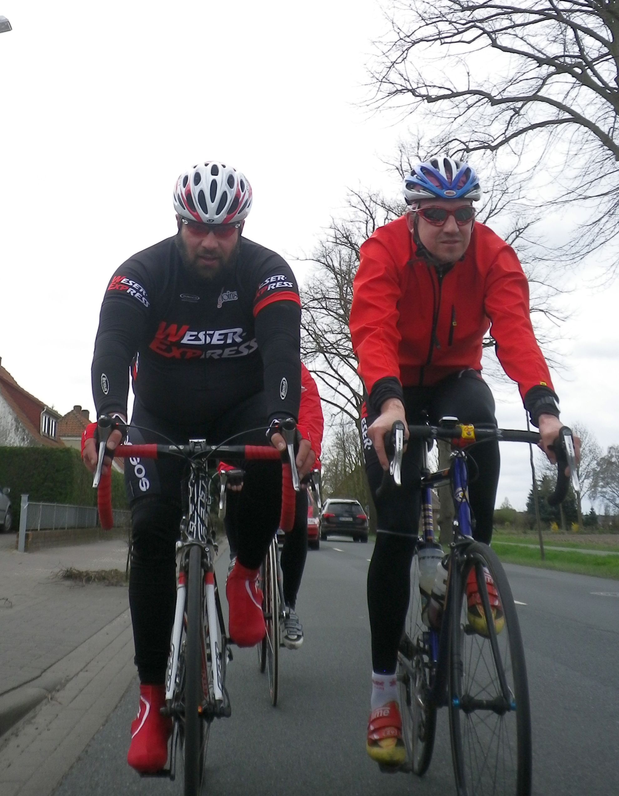 So sahen wir am Start aus. Das Team Weserexpress in den Vereinsfarben Rot-Schwarz-Lila-Weiß-Orange-Türkis-Grau. Bis auf Tobi habe ich die anderen nicht mehr wieder gesehen. Nein doch: Karin überholte mich auf einem besonders flachen Teilstück der RTF, ebenso Torsten ein wenig vorher. Dafür trafen wir unerwartet Schieber (The Pusher) am Kontrollpunkt.