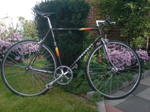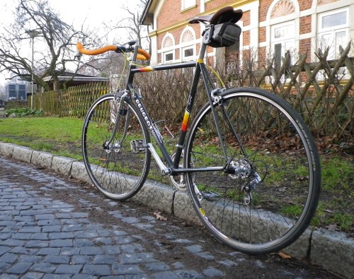 Das De Rosa Giro d’Italia löst mein Union Sapporo Fixie ab, das erste Fixie dass ich für mich vor fünf Jahren aufgebaut hatte und mit dem ich seitdem bei Wind und Wetter zur Arbeit, durch die Stadt oder auch mal durch die Landschaft gefahren bin. Einmal habe ich es auch gewagt damit die 210 km des Radmarathons des RSC Rot-Gold in Bremen in Angriff zu nehmen. Fünf Jahre sind eine lange Zeit, ich habe nur drei Räder die ich länger besitze (zwei für die Vitrine und eins was diesen Winter durch etwas fulminantes ersetzt wird). Das Umberto Dei mit Schutzblechen, Schaltung und Riser Lenker ist nun die erste Wahl für Winter und Regen; aber ich wollte doch noch gerne ein Fixie für die schönen Tage in Bremen besitzen.