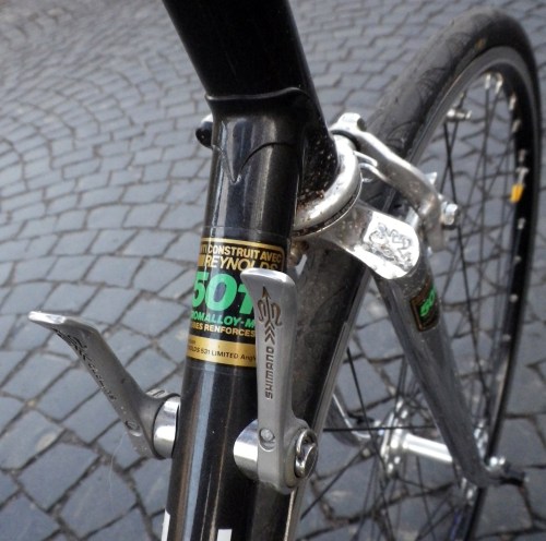 Klar, an das Rad hätten auch gut ein paar Campa Monoplaner, vielleicht sogar Deltas gepasst und sonst sind die Shimano Dura Ace AX auch sehr schöne Bremsen. Das sind aber auch die Campagnolo Super Veloce in silber und zwar bevor die im letzten Update eine sehr häßliche Ausschabung bekommen haben oder, in den teureren Campa Gruppen nur noch als Skeleton angeboten werden. Die Campa Superveloce habe ich nun auf fast allen meinen Rädern montiert, die Bremsleistung und Modulation ist sehr gut, und der Preis von €25 bei CNC ist unschlagbar. Für das Geld bekommt man manchmal ja nur Beläge plus Schuhe.