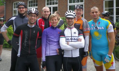 So sahen wir am Start aus. Das Team Weserexpress in den Vereinsfarben Rot-Schwarz-Lila-Weiß-Orange-Türkis-Grau. Bis auf Tobi habe ich die anderen nicht mehr wieder gesehen. Nein doch: Karin überholte mich auf einem besonders flachen Teilstück der RTF, ebenso Torsten ein wenig vorher. Dafür trafen wir unerwartet Schieber (The Pusher) am Kontrollpunkt.